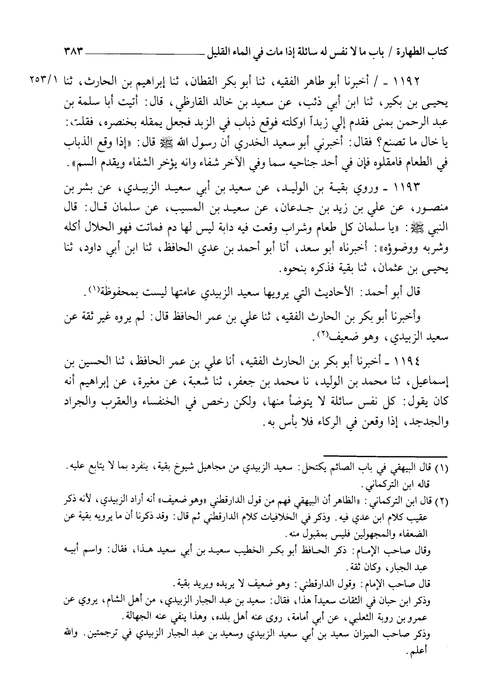 1193 - وَرَوَى بَقِيَّةُ بْنُ الْوَلِيدِ، عَنْ سَعِيدِ بْنِ أَبِي سَعِيدٍ الزُّبَيْدِيِّ، عَنْ بِشْرِ بْنِ مَنْصُورٍ، عَنْ عَلِيِّ بْنِ زَيْدِ بْنِ جُدْعَانَ، عَنْ سَعِيدِ بْنِ الْمُسَيِّبِ، عَنْ سَلْمَانَ، قَالَ: قَالَ النَّبِيُّ صَلَّى اللهُ عَلَيْهِ وَسَلَّمَ: " يَا سَلْمَانُ §كُلُّ طَعَامٍ وَشَرَابٍ وَقَعَتْ فِيهِ دَابَّةٌ لَيْسَ لَهَا دَمٌ فَمَاتَتْ فَهُوَ الْحَلَالُ أَكْلُهُ وَشُرْبُهُ وَوُضُوءُهُ " أَخْبَرَنَاهُ أَبُو سَعْدٍ أَنَا أَبُو أَحْمَدَ بْنُ عَدِيٍّ الْحَافِظُ، ثنا ابْنُ أَبِي دَاوُدَ، ثنا يَحْيَى بْنُ عُثْمَانَ، ثنا بَقِيَّةُ فَذَكَرَهُ بِنَحْوِهِ، قَالَ أَبُو أَحْمَدَ: الْأَحَادِيثُ الَّتِي يَرْوِيهَا سَعِيدٌ الزُّبَيْدِيُّ عَامَّتُهَا لَيْسَتْ بِمَحْفُوظَةٍ وَأَخْبَرَنَا أَبُو بَكْرِ بْنُ الْحَارِثِ الْفَقِيهُ، ثنا عَلِيُّ بْنُ عُمَرَ الْحَافِظُ، قَالَ: لَمْ يَرْوِهِ غَيْرُ ثِقَةٍ، عَنْ سَعِيدٍ الزُّبَيْدِيِّ وَهُوَ ضَعِيفٌ