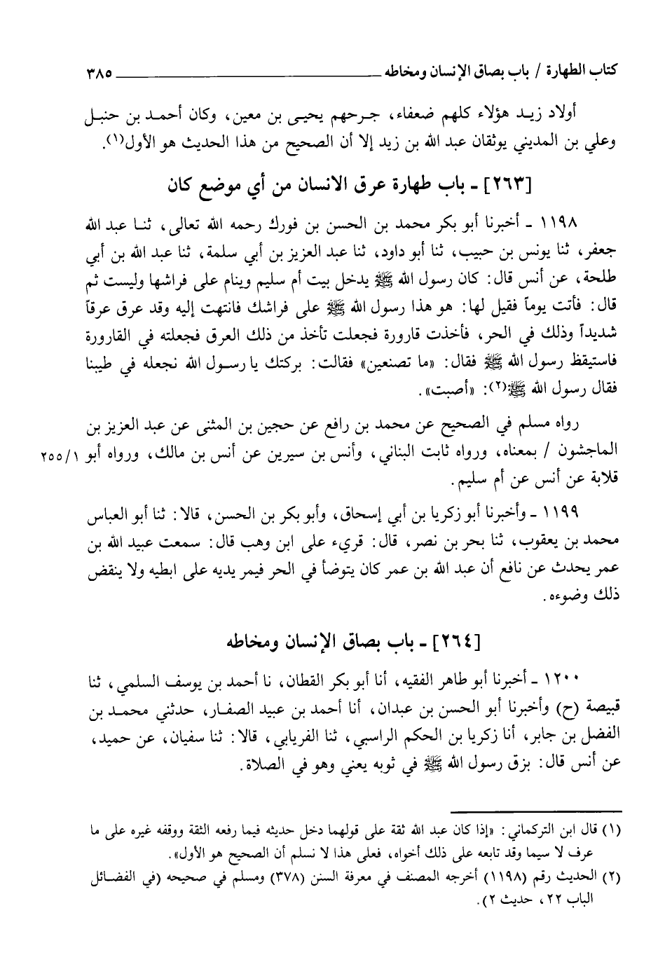 1198 - أَخْبَرَنَا أَبُو بَكْرٍ مُحَمَّدُ بْنُ الْحَسَنِ بْنِ فُورَكٍ رَحِمَهُ اللهُ تَعَالَى، ثنا عَبْدُ اللهِ بْنُ جَعْفَرٍ، ثنا يُونُسُ بْنُ حَبِيبٍ، ثنا أَبُو دَاوُدَ، ثنا عَبْدُ الْعَزِيزِ بْنُ أَبِي سَلَمَةَ، ثنا إِسْحَاقُ بْنُ عَبْدِ اللهِ بْنِ أَبِي طَلْحَةَ، عَنْ أَنَسٍ، قَالَ: كَانَ رَسُولُ اللهِ صَلَّى اللهُ عَلَيْهِ وَسَلَّمَ §يَدْخُلُ بَيْتَ أُمِّ سُلَيْمٍ وَيَنَامُ عَلَى فِرَاشِهَا وَلَيْسَتْ ثَمَّ، قَالَ: فَأَتَتْ يَوْمًا فَقِيلَ لَهَا: هُوَ هَذَا رَسُولُ اللهِ صَلَّى اللهُ عَلَيْهِ وَسَلَّمَ عَلَى فِرَاشِكِ فَانْتَهَتْ إِلَيْهِ وَقَدْ عَرِقَ عَرَقًا شَدِيدًا وَذَلِكَ فِي الْحَرِّ فَأَخَذَتْ قَارُورَةً فَجَعَلَتْ تَأْخُذُ مِنْ ذَلِكَ الْعَرَقِ فَجَعَلَتْهُ فِي الْقَارُورَةِ فَاسْتَيْقَظَ رَسُولُ اللهِ صَلَّى اللهُ عَلَيْهِ وَسَلَّمَ فَقَالَ: " مَا تَصْنَعِينَ؟ " فَقَالَتْ: بَرَكَتُكَ يَا رَسُولَ اللهِ نَجْعَلُهُ فِي طِيبِنَا فَقَالَ رَسُولُ اللهِ صَلَّى اللهُ عَلَيْهِ وَسَلَّمَ: " أَصَبْتِ " رَوَاهُ مُسْلِمٌ فِي الصَّحِيحِ عَنْ مُحَمَّدِ بْنِ رَافِعٍ، عَنْ حُجَيْنِ بْنِ الْمُثَنَّى، عَنْ عَبْدِ الْعَزِيزِ بْنِ الْمَاجِشُونِ بِمَعْنَاهُ، وَرَوَاهُ ثَابِتٌ الْبُنَانِيُّ وَأَنَسُ بْنُ سِيرِينَ، عَنْ أَنَسِ بْنِ مَالِكٍ وَرَوَاهُ أَبُو قِلَابَةَ، عَنْ أَنَسٍ، عَنْ أُمِّ سُلَيْمٍ