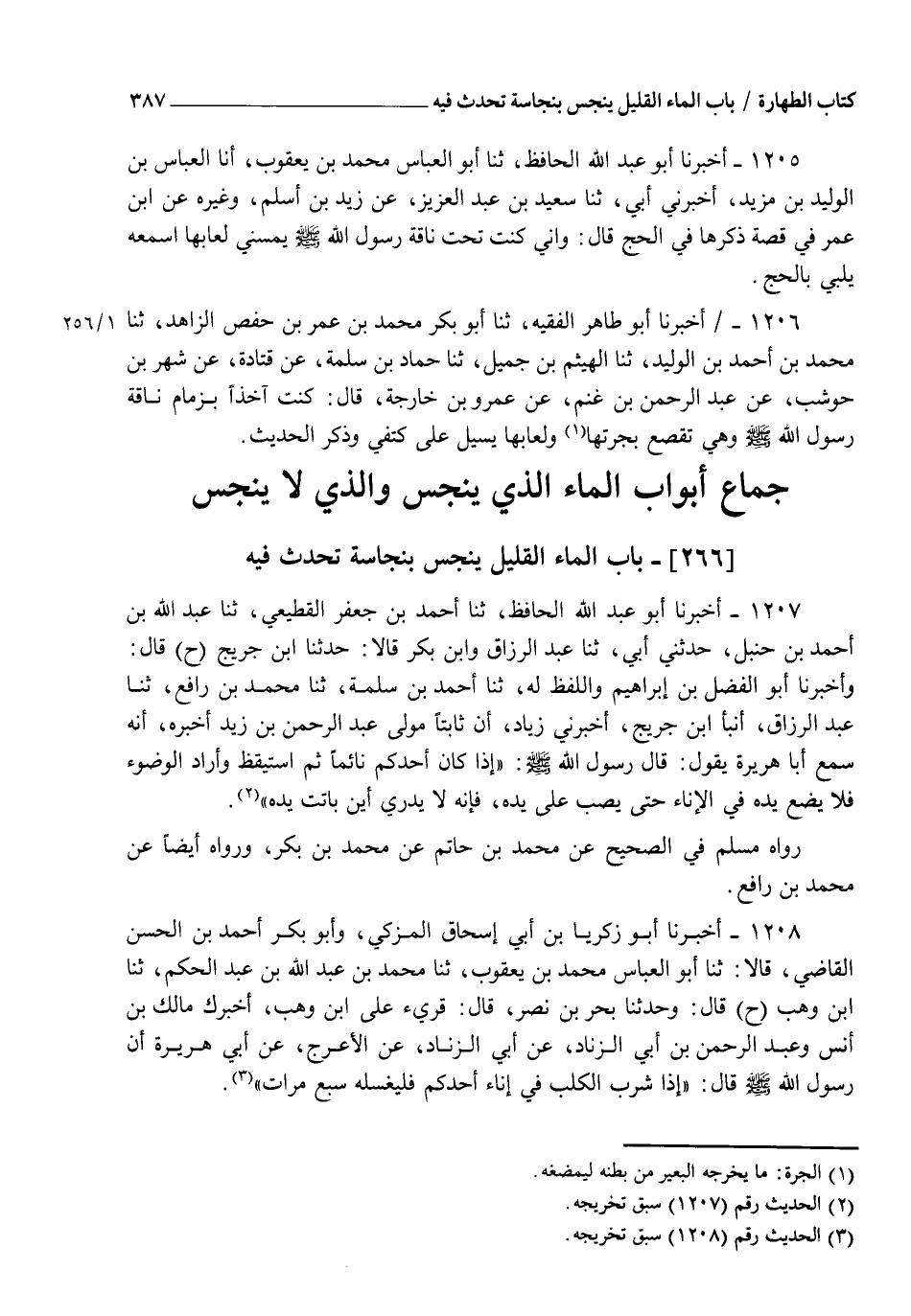 1207 - أَخْبَرَنَا أَبُو عَبْدِ اللهِ الْحَافِظُ، ثنا أَحْمَدُ بْنُ جَعْفَرٍ الْقَطِيعِيُّ، ثنا عَبْدُ اللهِ بْنُ أَحْمَدَ بْنِ حَنْبَلٍ، حَدَّثَنِي أَبِي، ثنا عَبْدُ الرَّزَّاقِ، وَابْنُ بَكْرٍ قَالَا: حَدَّثَنَا ابْنُ جُرَيْجٍ، ح. قَالَ: وَأَخْبَرَنَا أَبُو الْفَضْلِ بْنُ إِبْرَاهِيمَ، وَاللَّفْظُ لَهُ، ثنا أَحْمَدُ بْنُ سَلَمَةَ، ثنا مُحَمَّدُ بْنُ رَافِعٍ، ثنا عَبْدُ الرَّزَّاقِ، أنبأ ابْنُ جُرَيْجٍ، أَخْبَرَنِي زِيَادٌ، أَنَّ ثَابِتًا مَوْلَى عَبْدِ الرَّحْمَنِ بْنِ زَيْدٍ أَخْبَرَهُ، أَنَّهُ سَمِعَ أَبَا هُرَيْرَةَ، يَقُولُ: قَالَ رَسُولُ اللهِ صَلَّى اللهُ عَلَيْهِ وَسَلَّمَ: §" إِذَا كَانَ أَحَدُكُمْ نَائِمًا ثُمَّ اسْتَيْقَظَ وَأَرَادَ الْوُضُوءَ فَلَا يَضَعْ يَدَهُ فِي الْإِنَاءِ حَتَّى يَصُبَّ عَلَى يَدِهِ فَإِنَّهُ لَا يَدْرِي أَيْنَ بَاتَتْ يَدُهُ " رَوَاهُ مُسْلِمٌ فِي الصَّحِيحِ عَنْ مُحَمَّدِ بْنِ حَاتِمٍ عَنْ مُحَمَّدِ بْنِ بَكْرٍ وَرَوَاهُ أَيْضًا، عَنْ مُحَمَّدِ بْنِ رَافِعٍ