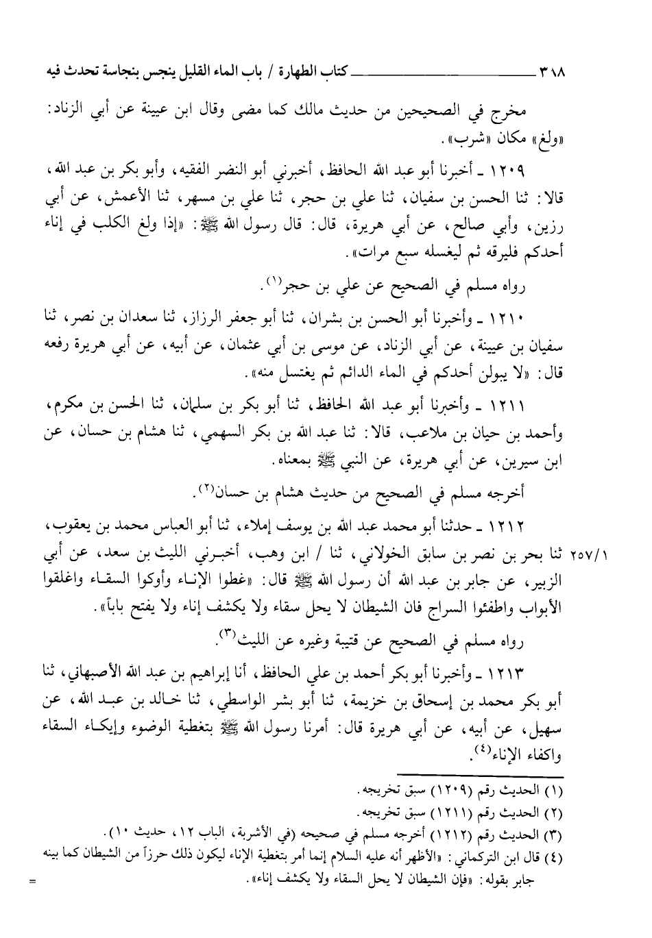 1209 - أَخْبَرَنَا أَبُو عَبْدِ اللهِ الْحَافِظُ، أَخْبَرَنِي أَبُو النَّضْرِ الْفَقِيهُ، وَأَبُو بَكْرِ بْنُ عَبْدِ اللهِ قَالَا: ثنا الْحَسَنُ بْنُ سُفْيَانَ، ثنا عَلِيُّ بْنُ حُجْرٍ، ثنا عَلِيُّ بْنُ مُسْهِرٍ، ثنا الْأَعْمَشُ، عَنْ أَبِي رَزِينٍ، وَأَبِي صَالِحٍ، عَنْ أَبِي هُرَيْرَةَ، قَالَ: قَالَ رَسُولُ اللهِ صَلَّى اللهُ عَلَيْهِ وَسَلَّمَ: " §إِذَا وَلَغَ الْكَلْبُ فِي إِنَاءِ أَحَدِكُمْ فَلْيُرِقْهُ، ثُمَّ لِيَغْسِلْهُ سَبْعَ مَرَّاتٍ " رَوَاهُ مُسْلِمٌ فِي الصَّحِيحِ عَنْ عَلِيِّ بْنِ حُجْرٍ
