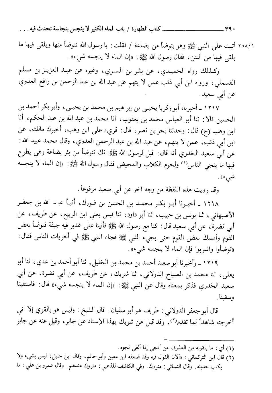 1217 - أَخْبَرَنَاهُ أَبُو زَكَرِيَّا يَحْيَى بْنُ إِبْرَاهِيمَ بْنِ مُحَمَّدِ بْنِ يَحْيَى وَأَبُو بَكْرٍ أَحْمَدُ بْنُ حَسَنٍ قَالَا: ثنا أَبُو الْعَبَّاسِ مُحَمَّدُ بْنُ يَعْقُوبَ أنا مُحَمَّدُ بْنُ عَبْدِ اللهِ بْنِ عَبْدِ الْحَكَمِ، أنا ابْنُ وَهْبٍ، ح. قَالَ: وَحَدَّثَنَا بَحْرُ بْنُ نَصْرٍ، قَالَ: قُرِئَ عَلَى ابْنِ وَهْبٍ: أَخْبَرَكَ مَالِكٌ، عَنِ ابْنِ أَبِي ذِئْبٍ، عَمَّنْ لَا يُتَّهَمُ، عَنْ عَبْدِ اللهِ بْنِ عَبْدِ الرَّحْمَنِ الْعَدَوِيِّ، وَقَالَ مُحَمَّدٌ: عُبَيْدُ اللهِ: عَنْ أَبِي سَعِيدٍ الْخُدْرِيِّ أَنَّهُ قَالَ: قِيلَ لِرَسُولِ اللهِ صَلَّى اللهُ عَلَيْهِ وَسَلَّمَ إِنَّكَ تَتَوَضَّأُ مِنْ بِئْرِ بُضَاعَةَ وَهِيَ يُطْرَحُ فِيهَا مَا يُنْجِي النَّاسُ وَلُحُومُ الْكِلَابِ وَالْمَحِيضُ فَقَالَ رَسُولُ اللهِ صَلَّى اللهُ عَلَيْهِ وَسَلَّمَ: §" إِنَّ الْمَاءَ لَا يُنَجِّسُهُ شَيْءٌ " وَقَدْ رُوِيَتْ هَذِهِ اللَّفْظَةُ مِنْ وَجْهٍ آخَرَ، عَنْ أَبِي سَعِيدٍ مَرْفُوعًا