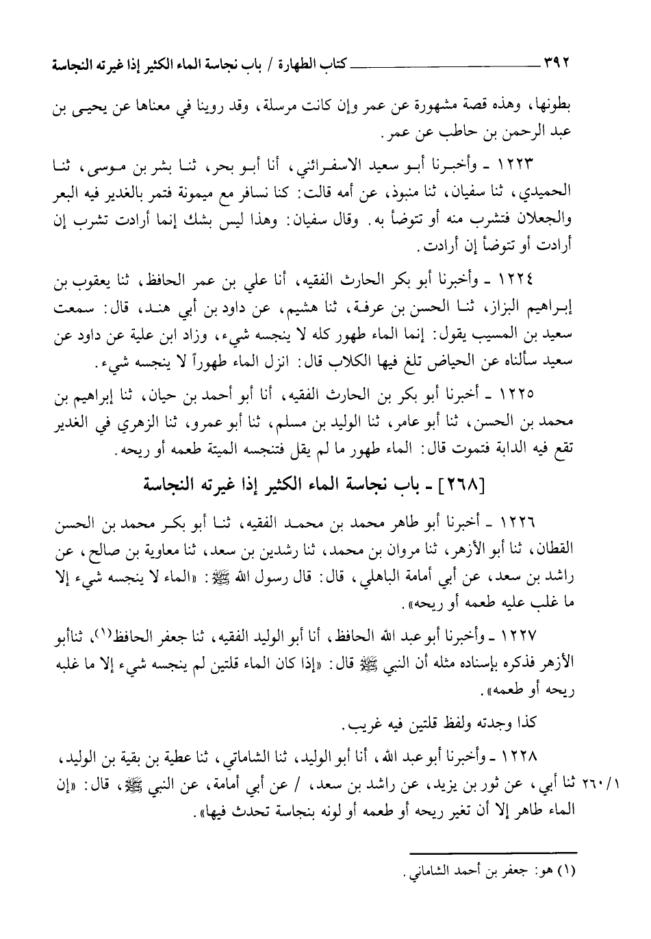 1226 - أَخْبَرَنَا أَبُو طَاهِرٍ مُحَمَّدُ بْنُ مُحَمَّدٍ الْفَقِيهُ ثنا أَبُو بَكْرٍ مُحَمَّدُ بْنُ الْحَسَنِ الْقَطَّانُ، ثنا أَبُو الْأَزْهَرِ، ثنا مَرْوَانُ بْنُ مُحَمَّدٍ، ثنا رِشْدِينُ بْنُ سَعْدٍ، ثنا مُعَاوِيَةُ بْنُ صَالِحٍ، عَنْ رَاشِدِ بْنِ سَعْدٍ، عَنْ أَبِي أُمَامَةَ الْبَاهِلِيِّ، قَالَ: قَالَ رَسُولُ اللهِ صَلَّى اللهُ عَلَيْهِ وَسَلَّمَ: §" الْمَاءُ لَا يُنَجِّسُهُ شَيْءٌ إِلَّا مَا غَلَبَ عَلَيْهِ طَعْمُهُ أَوْ رِيحُهُ "