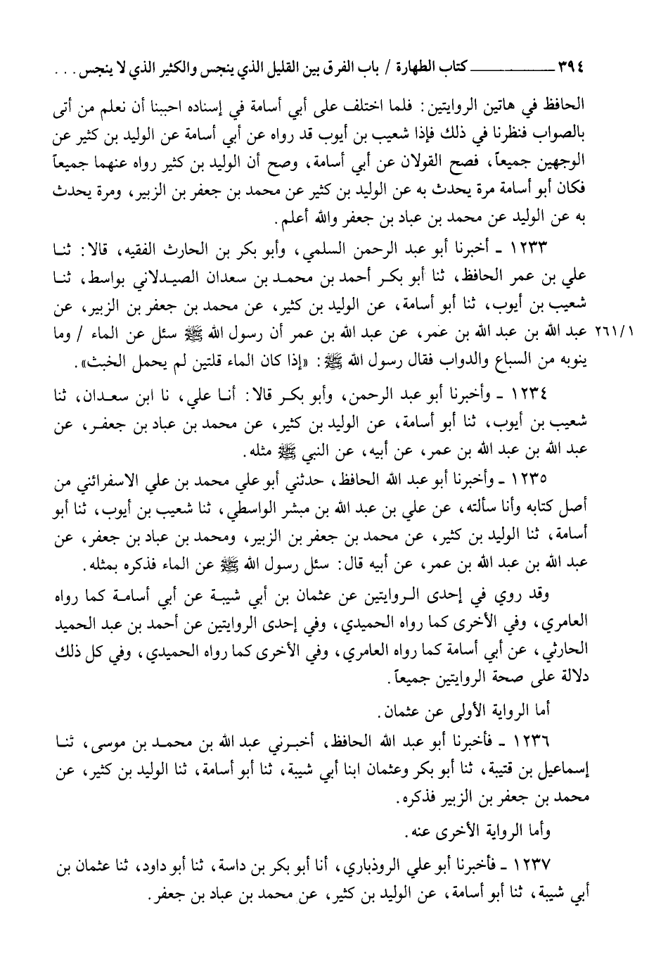 1233 - أَخْبَرَنَا أَبُو عَبْدِ الرَّحْمَنِ السُّلَمِيُّ، وَأَبُو بَكْرِ بْنُ الْحَارِثِ الْفَقِيهُ قَالَا: ثنا عَلِيُّ بْنُ عُمَرَ الْحَافِظُ، ثنا أَبُو بَكْرٍ أَحْمَدُ بْنُ مُحَمَّدِ بْنِ سَعْدَانَ الصَّيْدَلَانِيُّ بِوَاسِطَ، ثنا شُعَيْبُ بْنُ أَيُّوبَ، ثنا أَبُو أُسَامَةَ، عَنِ الْوَلِيدِ بْنِ كَثِيرٍ، عَنْ مُحَمَّدِ بْنِ جَعْفَرِ بْنِ الزُّبَيْرِ، عَنْ عَبْدِ اللهِ بْنِ عَبْدِ اللهِ بْنِ عُمَرَ، عَنْ عَبْدِ اللهِ بْنِ عُمَرَ، أَنَّ رَسُولَ اللهِ صَلَّى اللهُ عَلَيْهِ وَسَلَّمَ سُئِلَ عَنِ الْمَاءِ وَمَا يَنُوبُهُ مِنَ السِّبَاعِ وَالدَّوَابِّ فَقَالَ رَسُولُ اللهِ صَلَّى اللهُ عَلَيْهِ وَسَلَّمَ: " §إِذَا كَانَ الْمَاءُ قُلَّتَيْنِ لَمْ يَحْمِلِ الْخَبَثَ "