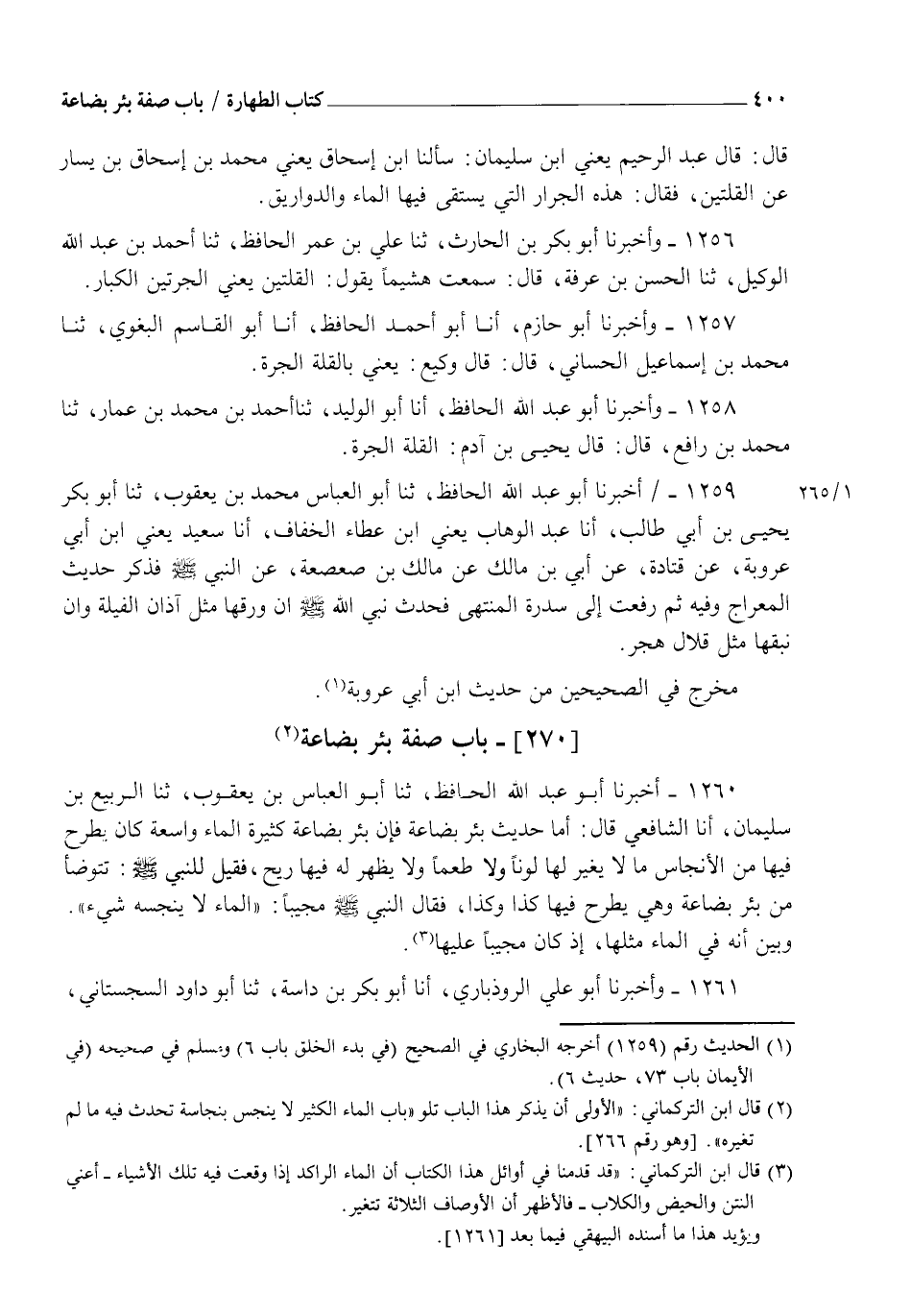 1260 - أَخْبَرَنَا أَبُو عَبْدِ اللهِ الْحَافِظُ، ثنا أَبُو الْعَبَّاسِ بْنُ يَعْقُوبَ، ثنا الرَّبِيعُ بْنُ سُلَيْمَانَ، أنا الشَّافِعِيُّ، قَالَ: §" أَمَّا حَدِيثُ بِئْرِ بُضَاعَةَ فَإِنَّ بِئْرَ بُضَاعَةَ كَثِيرَةُ الْمَاءِ وَاسِعَةٌ كَانَ يُطْرَحُ فِيهَا مِنَ الْأَنْجَاسِ مَا لَا يُغَيِّرُ لَهَا لَوْنًا وَلَا طَعْمًا وَلَا يَظْهَرُ لَهُ فِيهَا رِيحٌ فَقِيلَ لِلنَّبِيِّ صَلَّى اللهُ عَلَيْهِ وَسَلَّمَ: تَتَوَضَّأُ مِنْ بِئْرِ بُضَاعَةَ وَهِيَ يُطْرَحُ فِيهَا كَذَا وَكَذَا؟ فَقَالَ النَّبِيُّ صَلَّى اللهُ عَلَيْهِ وَسَلَّمَ مُجِيبًا: " الْمَاءُ لَا يُنَجِّسُهُ شَيْءٌ " وَبَيَّنَ أَنَّهُ فِي الْمَاءِ مِثْلُهَا إِذْ كَانَ مُجِيبًا عَلَيْهَا "