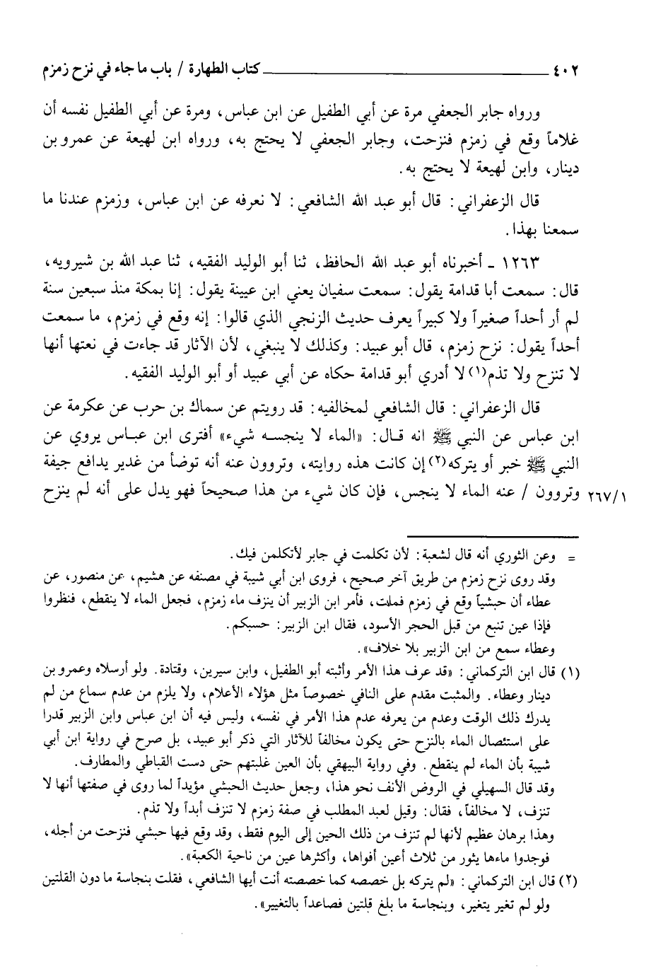 1263 - أَخْبَرَنَاهُ أَبُو عَبْدِ اللهِ الْحَافِظُ، ثنا أَبُو الْوَلِيدِ الْفَقِيهُ، ثنا عَبْدُ اللهِ بْنُ شِيرَوَيْهِ، قَالَ: سَمِعْتُ أَبَا قُدَامَةَ، يَقُولُ: سَمِعْتُ سُفْيَانَ يَعْنِي ابْنَ عُيَيْنَةَ، يَقُولُ: §" إِنَّا بِمَكَّةَ مُنْذُ سَبْعِينَ سَنَةً لَمْ أَرَ أَحَدًا صَغِيرًا وَلَا كَبِيرًا يَعْرِفُ حَدِيثَ الزَّنْجِيِّ الَّذِي قَالُوا إِنَّهُ وَقَعَ فِي زَمْزَمَ مَا سَمِعْتُ أَحَدًا يَقُولُ: نُزِحَ زَمْزَمُ قَالَ أَبُو عُبَيْدٍ: وَكَذَلِكَ لَا يَنْبَغِي لِأَنَّ الْآثَارَ قَدْ جَاءَتْ فِي نَعْتِهَا أَنَّهَا لَا تُنْزَحُ وَلَا تُذَمُّ لَا أَدْرِي أَبُو قُدَامَةَ حَكَاهُ عَنْ أَبِي عُبَيْدٍ وَأَبُو الْوَلِيدِ الْفَقِيهُ قَالَ الزَّعْفَرَانِيُّ: قَالَ الشَّافِعِيُّ لِمُخَالِفِيهِ: قَدْ رَوَيْتُمْ عَنْ سِمَاكِ بْنِ حَرْبٍ عَنْ عِكْرِمَةَ عَنِ ابْنِ عَبَّاسٍ عَنِ النَّبِيِّ صَلَّى اللهُ عَلَيْهِ وَسَلَّمَ أَنَّهُ قَالَ: الْمَاءُ لَا يُنَجِّسُهُ شَيْءٌ أَفَتَرَى أَنَّ ابْنَ عَبَّاسٍ يَرْوِي عَنِ النَّبِيِّ صَلَّى اللهُ عَلَيْهِ وَسَلَّمَ خَبَرًا وَيَتْرُكُهُ إِنْ كَانَتْ هَذِهِ رِوَايَتُهُ وَتَرْوُونَ عَنْهُ أَنَّهُ تَوَضَّأَ مِنْ غَدِيرٍ يُدَافِعُ جِيفَةً، وَتَرْوُونَ عَنْهُ: الْمَاءُ لَا يَنْجُسُ، فَإِنْ كَانَ شَيْءٌ مِنْ هَذَا صَحِيحًا فَهُوَ يَدُلُّ عَلَى أَنَّهُ لَمْ يَنْزَحْ -[403]- زَمْزَمَ لِلنَّجَاسَةِ وَلَكِنْ لِلتَّنْظِيفِ إِنْ كَانَ فَعَلَ وَزَمْزَمُ لِلشُّرْبِ وَقَدْ يَكُونُ الدَّمُ ظَهَرَ عَلَى الْمَاءِ حَتَّى رُئِيَ فِيهِ