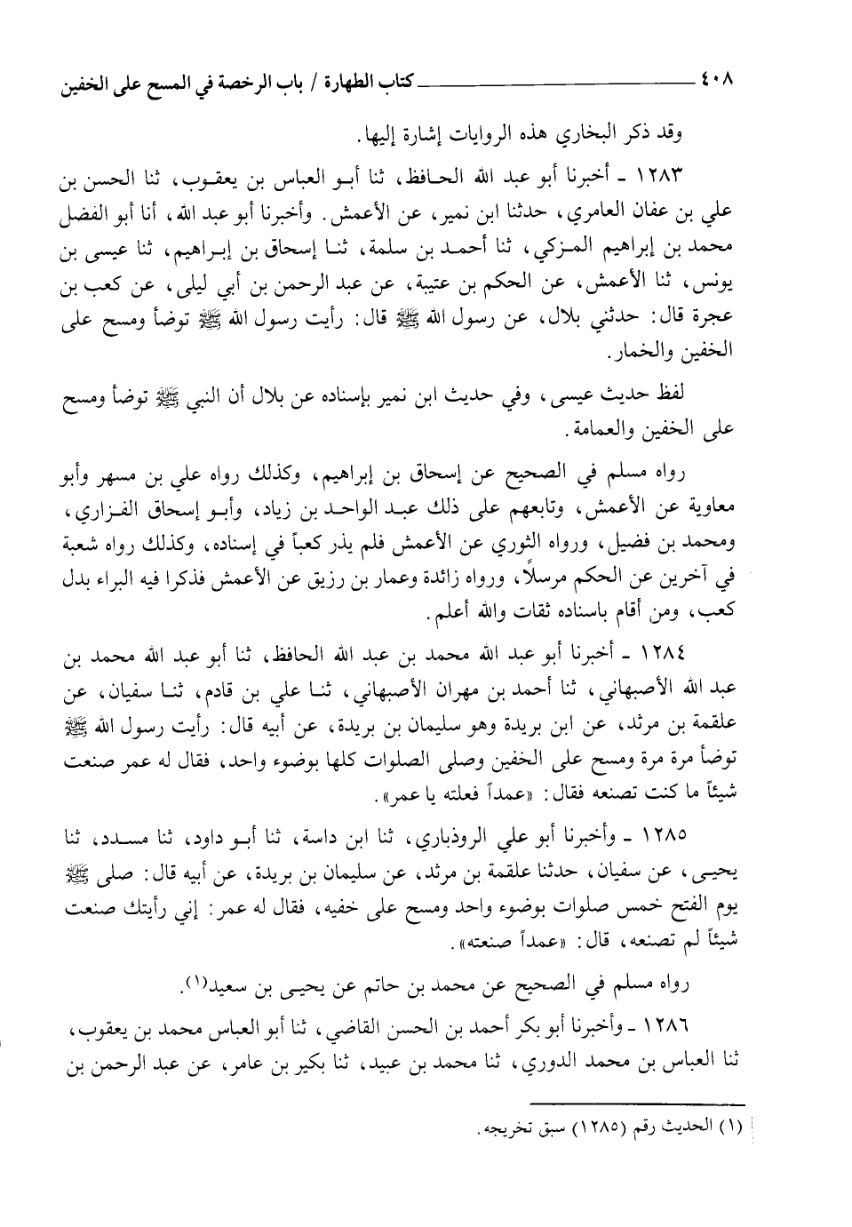 1283 - أَخْبَرَنَا أَبُو عَبْدِ اللهِ الْحَافِظُ، ثنا أَبُو الْعَبَّاسِ بْنُ يَعْقُوبَ، ثنا الْحَسَنُ بْنُ عَلِيِّ بْنِ عَفَّانَ الْعَامِرِيُّ، حَدَّثَنَا ابْنُ نُمَيْرٍ، عَنِ الْأَعْمَشِ، وَأَخْبَرَنَا أَبُو عَبْدِ اللهِ، أنا أَبُو الْفَضْلِ مُحَمَّدُ بْنُ إِبْرَاهِيمَ الْمُزَكِّي، ثنا أَحْمَدُ بْنُ سَلَمَةَ، ثنا إِسْحَاقُ بْنُ إِبْرَاهِيمَ، ثنا عِيسَى بْنِ يُونُسَ، ثنا الْأَعْمَشُ، عَنِ الْحَكَمِ بْنِ عُتَيْبَةَ، عَنْ عَبْدِ الرَّحْمَنِ بْنِ أَبِي لَيْلَى، عَنْ كَعْبِ بْنِ عُجْرَةَ، قَالَ: حَدَّثَنِي بِلَالٌ عَنْ رَسُولِ اللهِ صَلَّى اللهُ عَلَيْهِ وَسَلَّمَ قَالَ: §رَأَيْتُ رَسُولَ اللهِ صَلَّى اللهُ عَلَيْهِ وَسَلَّمَ تَوَضَّأَ وَمَسَحَ عَلَى الْخُفَّيْنِ وَالْخِمَارِ لَفْظُ حَدِيثِ عِيسَى وَفِي حَدِيثِ ابْنِ نُمَيْرٍ بِإِسْنَادِهِ عَنْ بِلَالٍ أَنَّ النَّبِيَّ صَلَّى اللهُ عَلَيْهِ وَسَلَّمَ تَوَضَّأَ وَمَسَحَ عَلَى الْخُفَّيْنِ وَالْعِمَامَةِ رَوَاهُ مُسْلِمٌ فِي الصَّحِيحِ عَنْ إِسْحَاقَ بْنِ إِبْرَاهِيمَ وَكَذَلِكَ رَوَاهُ عَلِيُّ بْنُ مُسْهِرٍ وَأَبُو مُعَاوِيَةَ عَنِ الْأَعْمَشِ وَتَابَعَهُمْ عَلَى ذَلِكَ عَبْدُ الْوَاحِدِ بْنُ زِيَادٍ وَأَبُو إِسْحَاقَ الْفَزَارِيُّ وَمُحَمَّدُ بْنُ فُضَيْلٍ وَرَوَاهُ الثَّوْرِيُّ عَنِ الْأَعْمَشِ فَلَمْ يَذْكُرْ كَعْبًا فِي إِسْنَادِهِ، وَكَذَلِكَ رَوَاهُ شُعْبَةُ فِي آخَرِينَ عَنِ الْحَكَمِ مُرْسَلًا، وَرَوَاهُ زَائِدَةُ وَعَمَّارُ بْنُ رُزَيْقٍ عَنِ الْأَعْمَشِ فَذَكَرَا فِيهِ الْبَرَاءَ بَدَلَ كَعْبٍ وَمَنْ أَقَامَ إِسْنَادَهُ ثِقَاتٌ وَاللهُ أَعْلَمُ