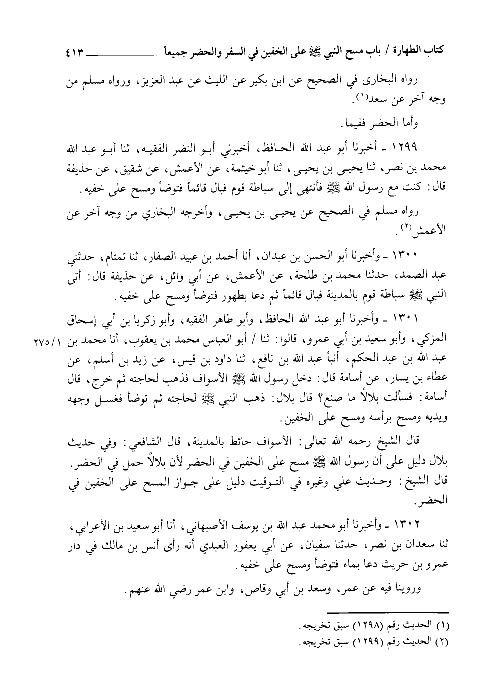 1301 - وَأَخْبَرَنَا أَبُو عَبْدِ اللهِ الْحَافِظُ، وَأَبُو طَاهِرٍ الْفَقِيهُ وَأَبُو زَكَرِيَّا بْنُ أَبِي إِسْحَاقَ الْمُزَكِّي وَأَبُو سَعِيدِ بْنُ أَبِي عَمْرٍو قَالُوا: ثنا أَبُو الْعَبَّاسِ مُحَمَّدُ بْنُ يَعْقُوبَ أنا مُحَمَّدُ بْنُ عَبْدِ اللهِ بْنِ عَبْدِ الْحَكَمِ، أنبأ عَبْدُ اللهِ بْنُ نَافِعٍ، ثنا دَاوُدُ بْنُ قَيْسٍ، عَنْ زَيْدِ بْنِ أَسْلَمَ، عَنْ عَطَاءِ بْنِ يَسَارٍ، عَنْ أُسَامَةَ، قَالَ: §" دَخَلَ رَسُولُ اللهِ صَلَّى اللهُ عَلَيْهِ وَسَلَّمَ الْأَسْوَافَ فَذَهَبَ لِحَاجَتِهِ، ثُمَّ خَرَجَ قَالَ أُسَامَةُ: فَسَأَلَتُ بِلَالًا مَا صَنَعَ؟ قَالَ بِلَالٌ: ذَهَبَ النَّبِيُّ صَلَّى اللهُ عَلَيْهِ وَسَلَّمَ لِحَاجَتِهِ، ثُمَّ تَوَضَّأَ فَغَسَلَ وَجْهَهُ وَيَدَيْهِ وَمَسَحَ بِرَأْسِهِ وَمَسَحَ عَلَى الْخُفَّيْنِ. قَالَ الشَّيْخُ رَحِمَهُ اللهُ تَعَالَى: الْأَسْوَافُ حَائِطٌ بِالْمَدِينَةِ قَالَ الشَّافِعِيُّ: وَفِي حَدِيثِ بِلَالٍ دَلِيلٌ عَلَى أَنَّ رَسُولَ اللهِ صَلَّى اللهُ عَلَيْهِ وَسَلَّمَ مَسَحَ عَلَى الْخُفَّيْنِ فِي الْحَضَرِ لِأَنَّ بِلَالًا حَمَلَ فِي الْحَضَرِ قَالَ الشَّيْخُ: وَحَدِيثُ عَلِيٍّ وَغَيْرِهِ فِي التَّوْقِيتِ دَلِيلٌ عَلَى جَوَازِ الْمَسْحِ عَلَى الْخُفَّيْنِ فِي الْحَضَرِ