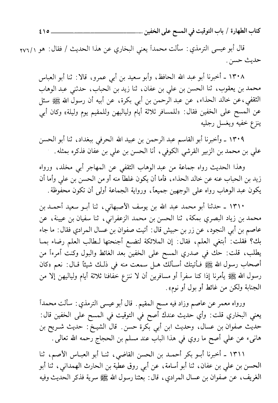1310 - حَدَّثَنَا أَبُو مُحَمَّدٍ عَبْدُ اللهِ بْنُ يُوسُفَ الْأَصْبَهَانِيُّ، ثنا أَبُو سَعِيدٍ أَحْمَدُ بْنُ مُحَمَّدِ بْنِ زِيَادٍ الْبَصْرِيُّ بِمَكَّةَ، ثنا الْحَسَنُ بْنُ مُحَمَّدٍ الزَّعْفَرَانِيُّ، ثنا سُفْيَانُ بْنُ عُيَيْنَةَ، عَنْ عَاصِمِ بْنِ أَبِي النَّجُودِ، عَنْ زِرِّ بْنِ حُبَيْشٍ، قَالَ: أَتَيْتُ صَفْوَانَ بْنَ عَسَّالٍ الْمُرَادِيَّ فَقَالَ: مَا جَاءَ بِكَ؟ فَقُلْتُ: أَبْتَغِي الْعِلْمَ، فَقَالَ: إِنَّ الْمَلَائِكَةَ لَتَضَعُ أَجْنِحَتَهَا لِطَالِبِ الْعِلْمِ رِضَاءً بِمَا يَطْلُبُ، قُلْتُ: حَكَّ فِي صَدْرِي الْمَسْحُ عَلَى الْخُفَّيْنِ بَعْدَ الْغَائِطِ وَالْبَوْلِ وَكُنْتُ امْرَأً مِنْ أَصْحَابِ رَسُولِ اللهِ صَلَّى اللهُ عَلَيْهِ وَسَلَّمَ فَأَتَيْتُكَ أَسْأَلُكَ هَلْ سَمِعْتَ مِنْهُ فِي ذَلِكَ شَيْئًا؟ قَالَ: نَعَمْ " كَانَّ رَسُولُ اللهِ صَلَّى اللهُ عَلَيْهِ وَسَلَّمَ §يَأْمُرُنَا إِذَا كُنَّا سَفَرًا أَوْ مُسَافِرِينَ أَنْ لَا نَنْزِعَ خِفَافَنَا ثَلَاثَةَ أَيَّامٍ وَلَيَالِيَهُنَّ إِلَّا مِنَ الْجَنَابَةِ وَلَكِنْ مِنْ غَائِطٍ أَوْ بَوْلٍ أَوْ نَوْمٍ " وَرَوَاهُ مَعْمَرٌ عَنْ عَاصِمٍ وَزَادَ فِيهِ مَسْحَ الْمُقِيمُ، قَالَ أَبُو عِيسَى التِّرْمِذِيُّ: سَأَلْتُ مُحَمَّدًا يَعْنِي الْبُخَارِيَّ قُلْتُ: وَأَيُّ حَدِيثٍ عِنْدَكَ أَصَحُّ فِي التَّوْقِيتُ فِي الْمَسْحُ عَلَى الْخُفَّيْنِ؟ قَالَ: حَدِيثُ صَفْوَانَ بْنِ عَسَّالٍ وَحَدِيثُ ابْنِ أَبِي بَكْرَةَ حَسَنٌ، قَالَ الشَّيْخُ: حَدِيثُ شُرَيْحِ بْنِ هَانِئٍ عَنْ عَلِيٍّ أَصَحُّ مَا رُوِيَ فِي هَذَا الْبَابِ عِنْدَ مُسْلِمِ بْنِ الْحَجَّاجِ رَحِمَهُ اللهُ تَعَالَى