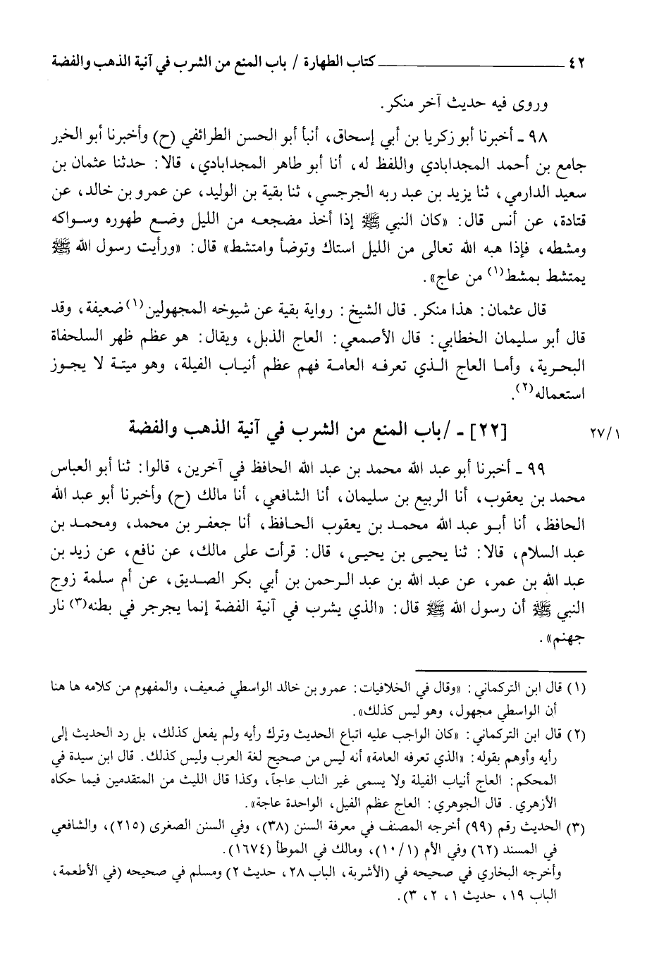 98 - أَخْبَرَنَا أَبُو زَكَرِيَّا بْنُ أَبِي إِسْحَاقَ، أنبأ أَبُو الْحَسَنِ الطَّرَائِفِيُّ، ح. وَأَخْبَرَنَا أَبُو الْخَيْرِ جَامِعُ بْنُ أَحْمَدَ الْمُحَمَّدَ آبَادِيُّ وَاللَّفْظُ لَهُ، أنا أَبُو طَاهِرٍ الْمَجْدَ آبَادِيُّ، قَالَ: حَدَّثَنَا عُثْمَانُ بْنُ سَعِيدٍ الدَّارِمِيُّ، ثنا يَزِيدُ بْنُ عَبْدِ رَبِهِ الْجُرْجُسِيُّ، ثنا بَقِيَّةُ بْنُ الْوَلِيدِ، عَنْ عَمْرِو بْنِ خَالِدٍ، عَنْ قَتَادَةَ، عَنْ أَنَسٍ، قَالَ: " كَانَ النَّبِيُّ صَلَّى اللهُ عَلَيْهِ وَسَلَّمَ §إِذَا أَخَذَ مَضْجَعَهُ مِنَ اللَّيْلِ وَضَعَ طَهُورَهُ وَسِوَاكَهُ وَمِشْطَهُ، فَإِذَا هَبَّهُ اللهُ تَعَالَى مِنَ اللَّيْلِ اسْتَاكَ، وَتَوَضَّأَ وَامْتَشَطَ ". قَالَ: " وَرَأَيْتُ رَسُولَ اللهِ صَلَّى اللهُ عَلَيْهِ وَسَلَّمَ يَتَمَشَّطُ بِمُشْطٍ مِنْ عَاجٍ ". قَالَ عُثْمَانُ: هَذَا مُنْكَرٌ. قَالَ الشَّيْخُ: رِوَايَةُ بَقِيَّةَ عَنْ شِيُوخِهِ الْمَجْهُولِينَ ضَعِيفَةٌ. وَقَدْ قَالَ أَبُو سُلَيْمَانَ الْخَطَّابِيُّ: قَالَ الْأَصْمَعِيُّ الْعَاجُ الذَّبْلُ وَيُقَالُ: هُوَ عَظْمُ ظَهْرِ السُّلَحْفَاةِ الْبَحْرِيَّةِ. وَأَمَّا الْعَاجُ الَّذِي تَعْرِفُهُ الْعَامَّةُ فَهُوَ عَظْمُ أَنْيَابِ الْفِيَلَةِ وَهُوَ مَيْتَةٌ لَا يَجُوزُ اسْتِعْمَالُهُ