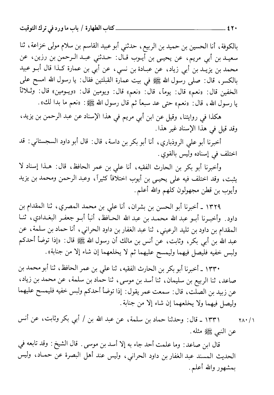 1329 - أَخْبَرَنَا أَبُو الْحَسَنِ بْنُ بِشَرَانَ، أنا عَلِيُّ بْنُ مُحَمَّدٍ الْمِصْرِيُّ، ثنا الْمِقْدَامُ بْنُ دَاوُدَ، وَأَخْبَرَنَا أَبُو عَبْدِ اللهِ مُحَمَّدُ بْنُ عَبْدِ اللهِ الْحَافِظُ أنبأ أَبُو جَعْفَرٍ الْبَغْدَادِيُّ، ثنا الْمِقْدَامُ بْنُ دَاوُدَ بْنِ تَلِيدٍ الرُّعَيْنِيُّ، ثنا عَبْدُ الْغَفَّارِ بْنُ دَاوُدَ الْحَرَّانِيُّ، أنا حَمَّادُ بْنُ سَلَمَةَ، عَنْ عَبْدِ اللهِ بْنِ أَبِي بَكْرٍ، وَثَابِتٍ، عَنْ أَنَسِ بْنِ مَالِكٍ، أَنَّ رَسُولَ اللهِ صَلَّى اللهُ عَلَيْهِ وَسَلَّمَ قَالَ: §" إِذَا تَوَضَّأَ أَحَدُكُمْ وَلَبِسَ خُفَّيْهِ فَلْيُصَلِّ فِيهِمَا وَلْيَمْسَحْ عَلَيْهِمَا ثُمَّ لَا يَخْلَعْهُمَا إِنْ شَاءَ إِلَّا مِنْ جَنَابَةٍ "