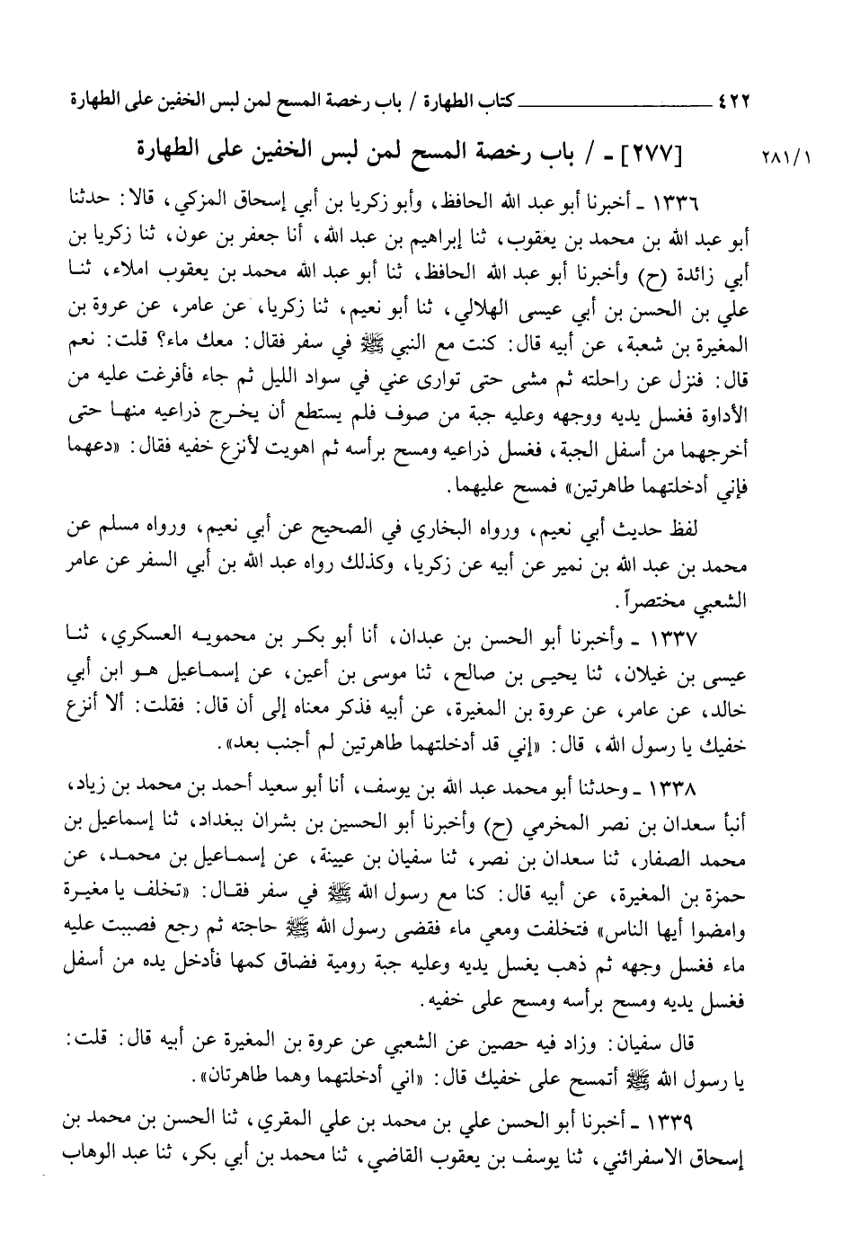 1338 - وَحَدَّثَنَا أَبُو مُحَمَّدٍ عَبْدُ اللهِ بْنُ يُوسُفَ، أنا أَبُو سَعِيدٍ أَحْمَدُ بْنُ مُحَمَّدِ بْنِ زِيَادٍ أنبأ سَعْدَانُ بْنُ نَصْرٍ الْمُخَرِّمِيُّ، ح. وَأَخْبَرَنَا أَبُو الْحُسَيْنِ بْنُ بِشْرَانَ بِبَغْدَادَ، ثنا إِسْمَاعِيلُ بْنُ مُحَمَّدٍ الصَّفَّارُ، ثنا سَعْدَانُ بْنُ نَصْرٍ، ثنا سُفْيَانُ بْنُ عُيَيْنَةَ، عَنْ إِسْمَاعِيلَ بْنِ مُحَمَّدٍ عَنْ حَمْزَةَ بْنِ الْمُغِيرَةِ، عَنْ أَبِيهِ، قَالَ: " كُنَّا مَعَ رَسُولِ اللهِ صَلَّى اللهُ عَلَيْهِ وَسَلَّمَ فِي سَفَرٍ فَقَالَ: " تَخَلَّفْ يَا مُغِيرَةُ وَامْضُوا أَيُّهَا النَّاسُ " فَتَخَلَّفْتُ وَمَعِيَ مَاءٌ فَقَضَى رَسُولُ اللهِ صَلَّى اللهُ عَلَيْهِ وَسَلَّمَ حَاجَتَهُ، ثُمَّ رَجَعَ فَصَبَبْتُ عَلَيْهِ مَاءً فَغَسَلَ وَجْهَهُ، ثُمَّ ذَهَبَ يَغْسِلُ يَدَيْهِ وَعَلَيْهِ جُبَّةٌ رُومِيَّةٌ فَضَاقَ كُمُّهَا فَأَدْخَلَ يَدَهُ مِنْ أَسْفَلَ §فَغَسَلَ يَدَيْهِ وَمَسَحَ بِرَأْسِهِ وَمَسَحَ عَلَى خُفَّيْهِ " قَالَ سُفْيَانُ وَزَادَ فِيهِ حُصَيْنٌ عَنِ الشَّعْبِيِّ عَنْ عُرْوَةَ بْنِ الْمُغِيرَةِ عَنْ أَبِيهِ قَالَ: قُلْتُ: يَا رَسُولَ اللهِ صَلَّى الله عَلَيْكَ أَتَمْسَحُ عَلَى خُفَّيْكَ؟ قَالَ: " إِنِّي أَدْخَلْتُهُمَا وَهُمَا طَاهِرَتَانِ "