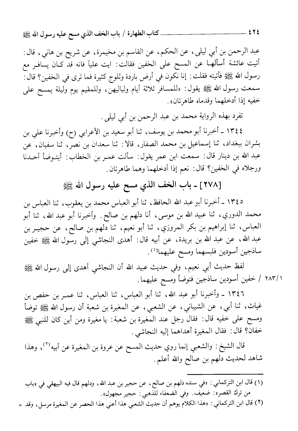 1346 - وَأَخْبَرَنَا أَبُو عَبْدِ اللهِ، ثنا أَبُو الْعَبَّاسِ، ثنا الْعَبَّاسُ، ثنا عُمَرُ بْنُ حَفْصِ بْنِ غِيَاثٍ، ثنا أَبِي، عَنِ الشَّيْبَانِيِّ، عَنِ الشَّعْبِيِّ، عَنِ الْمُغِيرَةِ بْنِ شُعْبَةَ " أَنَّ رَسُولَ اللهِ صَلَّى اللهُ عَلَيْهِ وَسَلَّمَ §تَوَضَّأَ وَمَسَحَ عَلَى خُفَّيْهِ " قَالَ: فَقَالَ رَجُلٌ عِنْدَ الْمُغِيرَةِ بْنِ شُعْبَةَ: يَا مُغِيرَةُ وَمَنْ أَيْنَ كَانَ لِلنَّبِيِّ صَلَّى اللهُ عَلَيْهِ وَسَلَّمَ خُفَّانِ؟ قَالَ: فَقَالَ الْمُغِيرَةُ: أَهْدَاهُمَا إِلَيْهِ النَّجَاشِيُّ. قَالَ الشَّيْخُ: وَالشَّعْبِيُّ إِنَّمَا رَوَى حَدِيثَ الْمَسْحِ عَنْ عُرْوَةَ بْنِ الْمُغِيرَةِ عَنْ أَبِيهِ وَهَذَا شَاهِدٌ لِحَدِيثِ دَلْهَمِ بْنِ صَالِحٍ وَاللهُ أَعْلَمُ