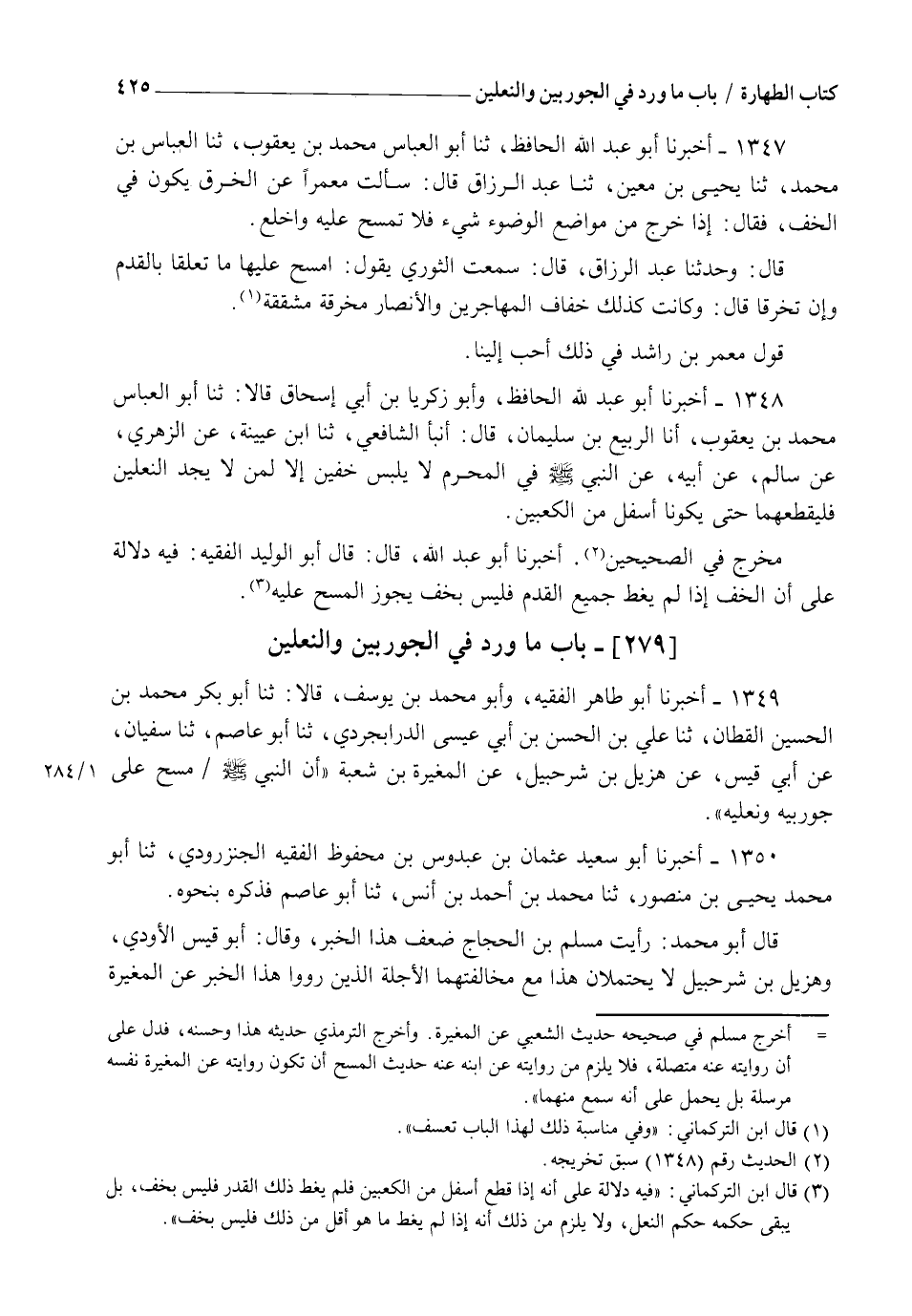 1349 - أَخْبَرَنَا أَبُو طَاهِرٍ الْفَقِيهُ، وَأَبُو مُحَمَّدِ بْنُ يُوسُفَ قَالَا: ثنا أَبُو بَكْرٍ مُحَمَّدُ بْنُ الْحُسَيْنِ الْقَطَّانُ، ثنا عَلِيُّ بْنُ الْحَسَنِ بْنِ أَبِي عِيسَى الدَّارَابَجِرْدِيُّ، ثنا أَبُو عَاصِمٍ، ثنا سُفْيَانُ، عَنْ أَبِي قَيْسٍ، عَنْ هُزَيْلِ بْنِ شُرَحْبِيلَ، عَنِ الْمُغِيرَةَ بْنِ شُعْبَةَ، أَنَّ النَّبِيَّ صَلَّى اللهُ عَلَيْهِ وَسَلَّمَ §مَسَحَ عَلَى جَوْرَبَيْهِ وَنَعْلَيْهِ