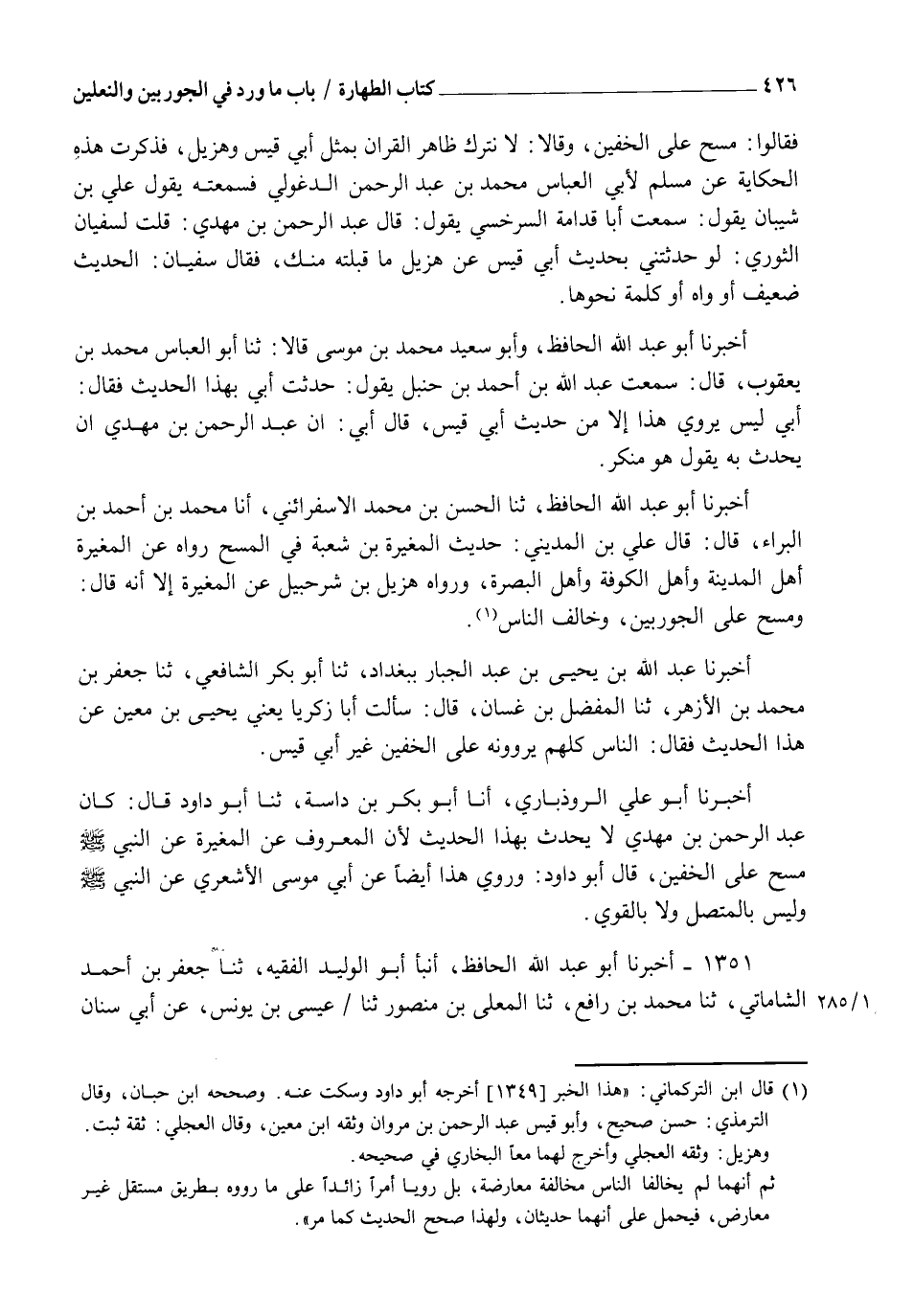 1351 - أَخْبَرَنَا أَبُو عَبْدِ اللهِ الْحَافِظُ، أنبأ أَبُو الْوَلِيدِ الْفَقِيهُ، ثنا جَعْفَرُ بْنُ أَحْمَدَ الشَّامَاتِيُّ، ثنا مُحَمَّدُ بْنُ رَافِعٍ، ثنا الْمُعَلَّى بْنُ مَنْصُورٍ، ثنا عِيسَى بْنُ يُونُسَ، عَنْ أَبِي سِنَانٍ -[427]- عِيسَى بْنِ سِنَانٍ عَنِ الضَّحَّاكِ بْنِ عَبْدِ الرَّحْمَنِ، عَنْ أَبِي مُوسَى قَالَ: " رَأَيْتُ رَسُولَ اللهِ صَلَّى اللهُ عَلَيْهِ وَسَلَّمَ §يَمْسَحُ عَلَى الْجَوْرَبَيْنِ وَالنَّعْلَيْنِ " قَالَ الضَّحَّاكُ بْنُ عَبْدِ الرَّحْمَنِ: لَمْ يَثْبُتْ سَمَاعُهُ مِنْ أَبِي مُوسَى , وَعِيسَى بْنِ سِنَانٍ ضَعِيفٌ لَا يُحْتَجُّ بِهِ وَأَخْبَرَنَا أَبُو عَبْدِ اللهِ الْحَافِظُ، ثنا أَبُو الْعَبَّاسِ بْنُ يَعْقُوبَ، ثنا الْعَبَّاسُ بْنُ مُحَمَّدٍ قَالَ: سَمِعْتُ يَحْيَى بْنَ مَعِينٍ يَقُولُ: عِيسَى بْنُ سِنَانٍ ضَعِيفٌ