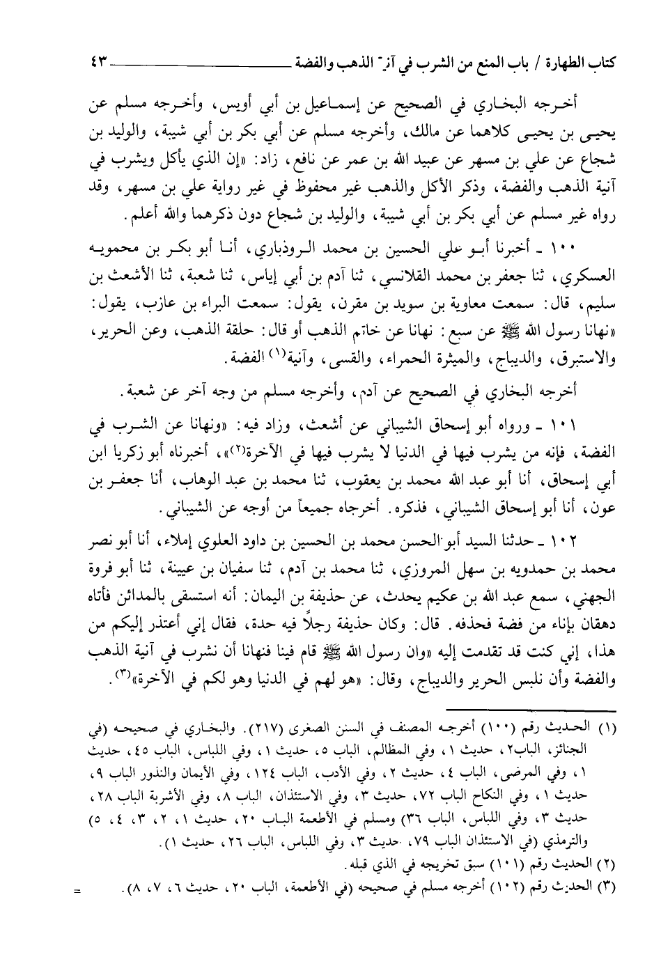 102 - حَدَّثَنَا السَّيِّدُ أَبُو الْحَسَنِ مُحَمَّدُ بْنُ الْحُسَيْنِ بْنِ دَاوُدَ الْعَلَوِيُّ، إِمْلَاءً، أنا أَبُو نَصْرٍ مُحَمَّدُ بْنُ حَمْدَوَيْهِ بْنِ سَهْلٍ الْمَرْوَزِيُّ، ثنا مُحَمَّدُ بْنُ آدَمَ، ثنا سُفْيَانُ بْنُ عُيَيْنَةَ، ثنا أَبُو فَرْوَةَ الْجُهَنِيُّ، سَمِعَ عَبْدَ اللهِ بْنَ عُكَيْمٍ يُحَدِّثُ عَنْ حُذَيْفَةَ بْنِ الْيَمَانِ، أَنَّهُ اسْتَسْقَى بِالْمَدَائِنِ فَأَتَاهُ دِهْقَانٌ بِإِنَاءٍ مِنْ فِضَّةٍ فَحَذَفَهُ قَالَ. وَكَانَ حُذَيْفَةُ رَجُلًا فِيهِ حِدَّةٌ فَقَالَ: إِنِّي أَعْتَذِرُ إِلَيْكُمْ مِنْ هَذَا، إِنِّي كُنْتُ قَدْ تَقَدَّمْتُ إِلَيْهِ، وَأَنَّ رَسُولَ اللهِ صَلَّى اللهُ عَلَيْهِ وَسَلَّمَ قَامَ فِينَا فَنَهَانَا أَنْ نَشْرَبَ فِي آنِيَةِ الذَّهَبِ وَالْفِضَّةِ، وَأَنْ نَلْبَسَ الْحَرِيرَ وَالدِّيبَاجَ. وَقَالَ: " §هُوَ لَهُمْ فِي الدُّنْيَا، وَهُوَ لَكُمْ فِي الْآخِرَةِ ". -[44]- أَخْرَجَهُ مُسْلِمُ بْنُ الْحَجَّاجِ فِي الصَّحِيحِ، عَنِ ابْنِ أَبِي عُمَرَ، وَغَيْرِهِ، عَنْ سُفْيَانَ