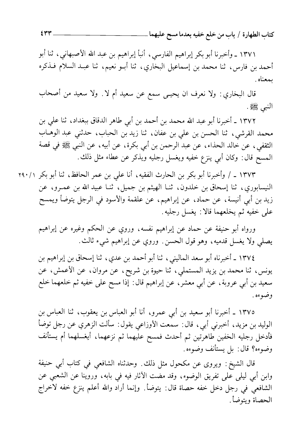 1373 - وَأَخْبَرَنَا أَبُو بَكْرِ بْنُ الْحَارِثِ الْفَقِيهُ، أنا عَلِيُّ بْنُ عُمَرَ الْحَافِظُ، ثنا أَبُو بَكْرٍ النَّيْسَابُورِيُّ، ثنا إِسْحَاقُ بْنُ خَلْدُونَ، ثنا الْهَيْثَمُ بْنُ جَمِيلٍ، ثنا عُبَيْدُ اللهِ بْنُ عَمْرٍو، عَنْ زَيْدِ بْنِ أَبِي أُنَيْسَةَ، عَنْ حَمَّادٍ، عَنْ إِبْرَاهِيمَ، عَنْ عَلْقَمَةَ، وَالْأَسْوَدِ، فِي الرَّجُلِ §يَتَوَضَّأُ وَيَمْسَحُ عَلَى خُفَّيْهِ، ثُمَّ يَخْلَعُهُمَا قَالَا: " يَغْسِلُ رِجْلَيْهِ ". وَرَوَاهُ أَبُو حَنِيفَةَ عَنْ حَمَّادٍ عَنْ إِبْرَاهِيمَ نَفْسِهِ وَرُوِيَ عَنِ الْحَكَمِ وَغَيْرِهِ عَنْ إِبْرَاهِيمَ يُصَلِّي وَلَا يَغْسِلُ قَدْمَيْهِ وَهُوَ قَوْلُ الْحَسَنِ وَرُوِيَ عَنْ إِبْرَاهِيمَ شَيْءٌ ثَالِثٌ