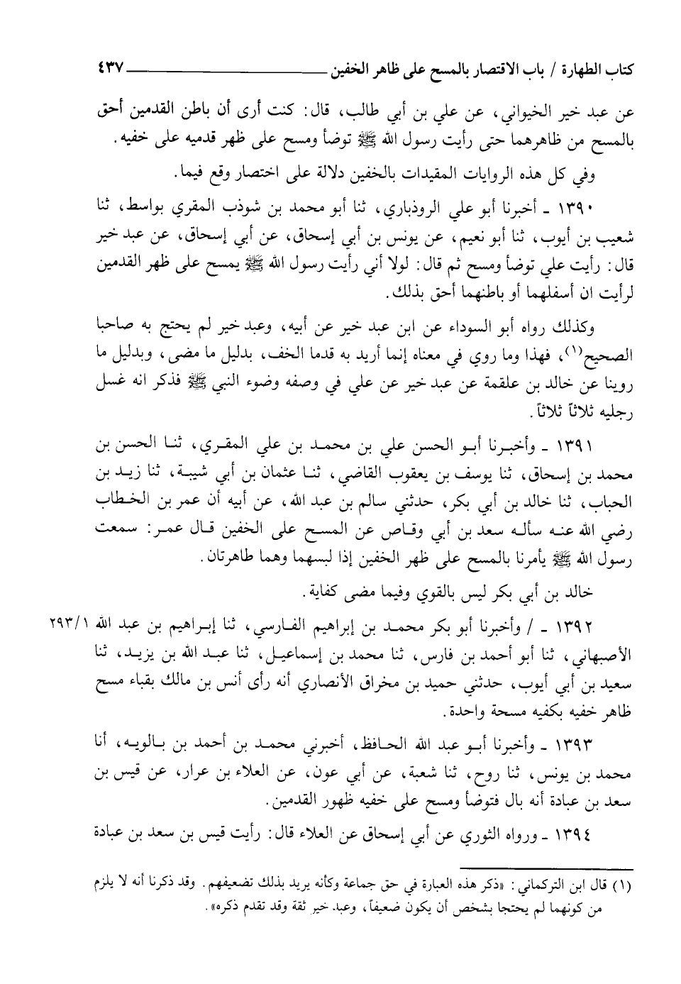 1390 - فِيمَا أَخْبَرَنَا أَبُو عَلِيٍّ الرُّوذْبَارِيُّ، ثنا أَبُو مُحَمَّدِ بْنُ شَوْذَبٍ الْمُقْرِئُ بِوَاسِطٍ، ثنا شُعَيْبُ بْنُ أَيُّوبَ، ثنا أَبُو نُعَيْمٍ، عَنْ يُونُسَ بْنِ أَبِي إِسْحَاقَ، عَنْ أَبِي إِسْحَاقَ، عَنْ عَبْدِ خَيْرٍ، قَالَ: رَأَيْتُ عَلِيًّا تَوَضَّأَ وَمَسَحَ ثُمَّ قَالَ: §" لَوْلَا أَنِّي رَأَيْتُ رَسُولَ اللهِ صَلَّى اللهُ عَلَيْهِ وَسَلَّمَ يَمْسَحُ عَلَى ظَهْرِ الْقَدْمَيْنِ لَرَأَيْتُ أَنَّ أَسْفَلَهُمَا أَوْ بَاطِنَهُمَا أَحَقُّ بِذَلِكَ " وَكَذَلِكَ رَوَاهُ أَبُو السَّوْدَاءِ عَنِ ابْنِ عَبْدِ خَيْرٍ عَنْ أَبِيهِ وَعَبْدُ خَيْرٍ لَمْ يَحْتَجَّ بِهِ صَاحِبَا الصَّحِيحِ فَهَذَا وَمَا رُوِيَ فِي مَعْنَاهُ إِنَّمَا أُرِيدَ بِهِ قَدَمَا الْخُفِّ بِدَلِيلِ مَا مَضَى وَبِدَلِيلِ مَا رُوِّينَا عَنْ خَالِدِ بْنِ عَلْقَمَةَ عَنْ عَبْدِ خَيْرٍ عَنْ عَلِيٍّ فِي وَصْفِهِ وُضُوءَ النَّبِيِّ صَلَّى اللهُ عَلَيْهِ وَسَلَّمَ فَذَكَرَ أَنَّهُ غَسَلَ رِجْلَيْهِ ثَلَاثًا ثَلَاثًا