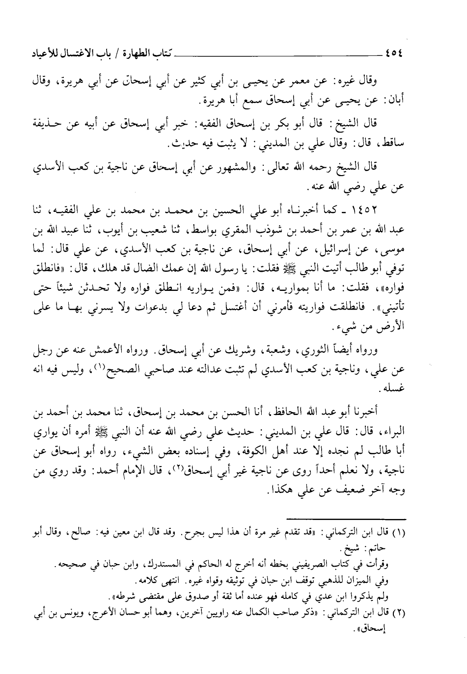 1452 - كَمَا أَخْبَرَنَاهُ أَبُو عَلِيٍّ الْحُسَيْنُ بْنُ مُحَمَّدِ بْنِ مُحَمَّدِ بْنِ عَلِيٍّ الْفَقِيهُ، ثنا عَبْدُ اللهِ بْنُ عُمَرَ بْنِ أَحْمَدَ بْنِ شَوْذَبٍ الْمُقْرِئُ بِوَاسِطَ، ثنا شُعَيْبُ بْنُ أَيُّوبَ، ثنا عُبَيْدُ اللهِ بْنُ مُوسَى، عَنْ إِسْرَائِيلَ، عَنْ أَبِي إِسْحَاقَ، عَنْ نَاجِيَةَ بْنِ كَعْبٍ الْأَسَدِيِّ، عَنْ عَلِيٍّ، قَالَ: لَمَّا تُوُفِّيَ أَبُو طَالِبٍ أَتَيْتُ النَّبِيَّ صَلَّى اللهُ عَلَيْهِ وَسَلَّمَ فَقُلْتُ: يَا رَسُولَ اللهِ إِنَّ عَمَّكَ الضَّالَّ قَدْ هَلَكَ قَالَ: " §فَانْطَلِقْ فَوَارِهِ " فَقُلْتُ: مَا أَنَا بِمُوَارِيهِ قَالَ: " فَمَنْ يُوَارِيهِ؟ " انْطَلِقْ فَوَارِهِ وَلَا تُحْدِثَنَّ شَيْئًا حَتَّى تَأْتِيَنِي " فَانْطَلَقْتُ فَوَارَيْتُهُ فَأَمَرَنِي أَنْ أَغْتَسِلَ، ثُمَّ دَعَا لِي بِدَعَوَاتٍ وَلَا يَسُرُّنِي بِهَا مَا عَلَى الْأَرْضِ مِنْ شَيْءٍ " وَرَوَاهُ أَيْضًا الثَّوْرِيُّ وَشُعْبَةُ وَشَرِيكٌ، عَنْ أَبِي إِسْحَاقَ، وَرَوَاهُ الْأَعْمَشُ عَنْهُ عَنْ رَجُلٍ، عَنْ عَلِيٍّ وَنَاجِيَةُ بْنُ كَعْبٍ الْأَسَدِيُّ لَمْ تَثْبُتْ عَدَالَتُهُ عِنْدَ صَاحِبَيِ الصَّحِيحِ وَلَيْسَ فِيهِ أَنَّهُ غَسَّلَهُ. أَخْبَرَنَا أَبُو عَبْدِ اللهِ الْحَافِظُ أَنَا الْحَسَنُ بْنُ مُحَمَّدِ بْنِ إِسْحَاقَ، ثنا مُحَمَّدُ بْنُ أَحْمَدَ بْنِ الْبَرَاءِ قَالَ: قَالَ عَلِيُّ بْنُ الْمَدِينِيِّ: حَدِيثُ عَلِيٍّ رَضِيَ اللهُ عَنْهُ أَنَّ النَّبِيَّ صَلَّى اللهُ عَلَيْهِ وَسَلَّمَ أَمَرَهُ أَنْ يُوَارِيَ أَبَا طَالِبٍ لَمْ نَجِدْهُ إِلَّا عِنْدَ أَهْلِ الْكُوفَةِ وَفِي إِسْنَادِهِ بَعْضُ الشَّيْءِ، رَوَاهُ أَبُو إِسْحَاقَ عَنْ نَاجِيَةَ وَلَا نَعْلَمُ أَحَدًا رَوَى عَنْ نَاجِيَةَ غَيْرَ أَبِي إِسْحَاقَ قَالَ الْإِمَامُ أَحْمَدُ: وَقَدْ رُوِيَ مِنْ وَجْهٍ آخَرَ ضَعِيفٍ عَنْ عَلِيٍّ هَكَذَا