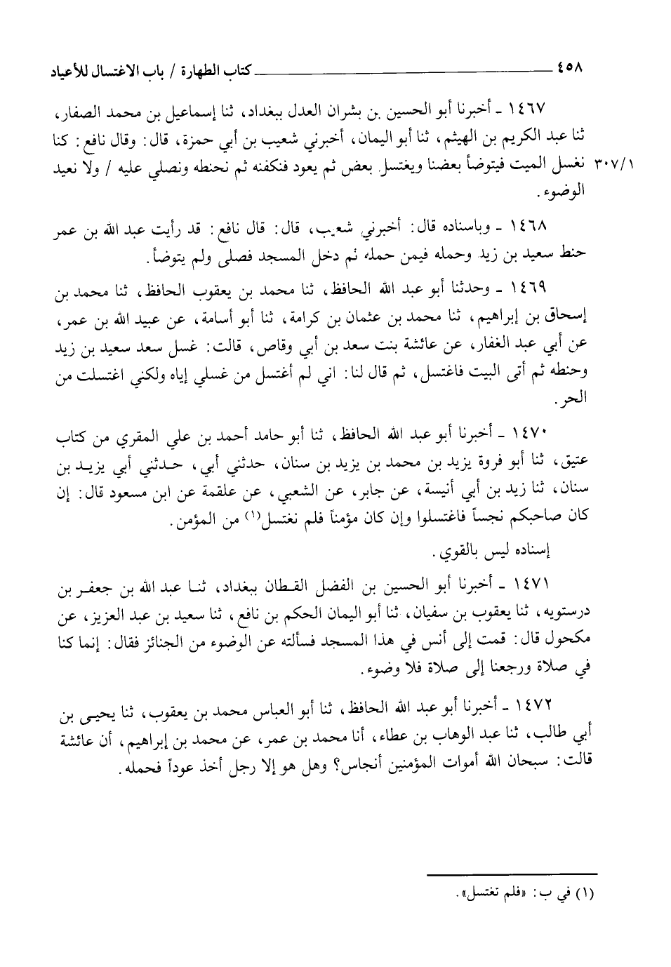 1467 - أَخْبَرَنَا أَبُو الْحُسَيْنِ بْنُ بِشْرَانَ الْعَدْلُ بِبَغْدَادَ، ثنا إِسْمَاعِيلُ بْنُ مُحَمَّدٍ الصَّفَّارُ، ثنا عَبْدُ الْكَرِيمِ بْنُ الْهَيْثَمِ، ثنا أَبُو الْيَمَانِ، أَخْبَرَنِي شُعَيْبُ بْنُ أَبِي حَمْزَةَ، قَالَ: وَقَالَ نَافِعٌ: " §كُنَّا نُغَسِّلُ الْمَيِّتَ فَيَتَوَضَّأُ بَعْضُنَا وَيَغْتَسِلُ بَعْضٌ، ثُمَّ يَعُودُ فَنُكَفِّنُهُ، ثُمَّ نُحَنِّطُهُ وَنُصَلِّي عَلَيْهِ وَلَا نُعِيدُ الْوُضُوءَ "