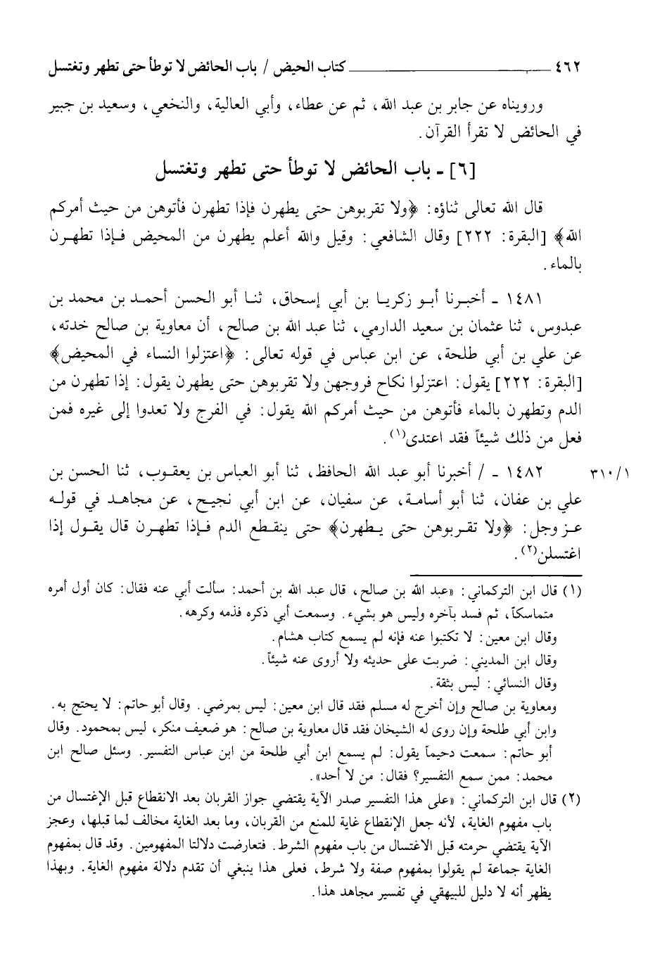 1481 - أَخْبَرَنَا أَبُو زَكَرِيَّا بْنُ أَبِي إِسْحَاقَ، ثنا أَبُو الْحَسَنِ أَحْمَدُ بْنُ مُحَمَّدِ بْنِ عَبْدُوسٍ، ثنا عُثْمَانُ بْنُ سَعِيدٍ الدَّارِمِيُّ، ثنا عَبْدُ اللهِ بْنُ صَالِحٍ، أَنَّ مُعَاوِيَةَ بْنَ صَالِحٍ، حَدَّثَهُ عَنْ عَلِيِّ بْنِ أَبِي طَلْحَةَ، عَنِ ابْنِ عَبَّاسٍ، فِي قَوْلِهِ تَعَالَى {اعْتَزِلُوا النِّسَاءَ فِي الْمَحِيضِ} يَقُولُ: " §اعْتَزِلُوا نِكَاحَ فُرُوجِهِنَّ {وَلَا تَقْرَبُوهُنَّ حَتَّى يَطْهُرْنَ} [البقرة: 222] يَقُولُ: إِذَا تَطَهَّرْنَ مِنَ الدَّمِ وَتَطَهَّرْنَ بِالْمَاءِ {فَأْتُوهُنَّ مِنْ حَيْثُ أَمَرَكُمُ اللهُ} [البقرة: 222] يَقُولُ: فِي الْفَرْجِ وَلَا تَعَدَّوْا إِلَى غَيْرِهِ فَمَنْ فَعَلَ مِنْ ذَلِكَ شَيْئًا فَقَدِ اعْتَدَى "