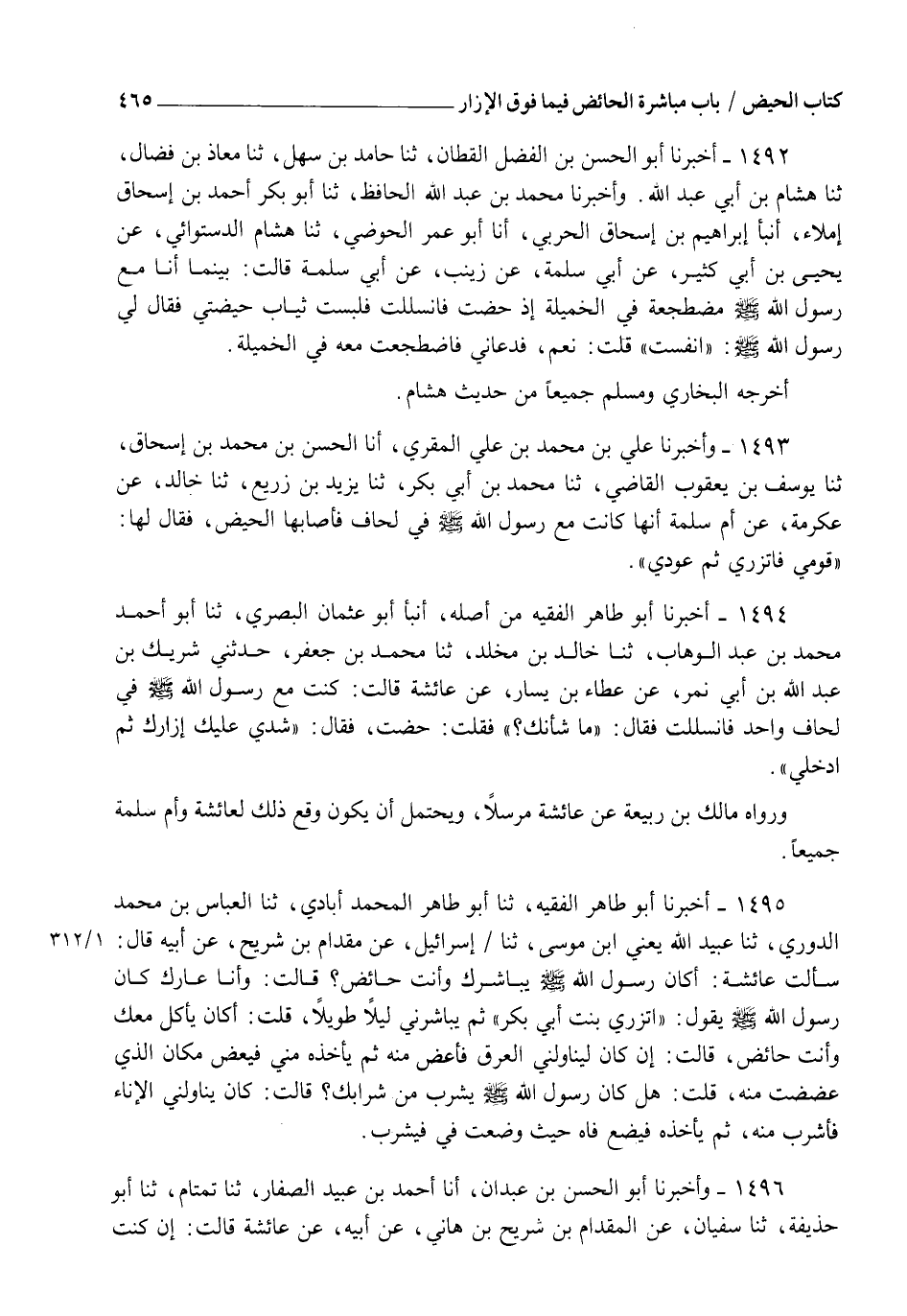 1492 - أَخْبَرَنَا أَبُو الْحُسَيْنِ بْنُ الْفَضْلِ الْقَطَّانُ، ثنا حَامِدُ بْنُ سَهْلٍ، ثنا مُعَاذُ بْنُ فَضَالَةَ، ثنا هِشَامُ بْنُ أَبِي عَبْدِ اللهِ، وَأَخْبَرَنَا مُحَمَّدُ بْنُ عَبْدِ اللهِ الْحَافِظُ، ثنا أَبُو بَكْرٍ أَحْمَدُ بْنُ إِسْحَاقَ إِمْلَاءً أنبأ إِبْرَاهِيمُ بْنُ إِسْحَاقَ الْحَرْبِيُّ، أنا أَبُو عُمَرَ الْحَوْضِيُّ، ثنا هِشَامٌ الدَّسْتُوَائِيُّ، عَنْ يَحْيَى بْنِ أَبِي كَثِيرٍ، عَنْ أَبِي سَلَمَةَ، عَنْ زَيْنَبَ، عَنْ أُمِّ سَلَمَةَ، قَالَتْ: بَيْنَمَا أنا مَعَ رَسُولِ اللهِ صَلَّى اللهُ عَلَيْهِ وَسَلَّمَ مُضْطَجِعَةٌ فِي الْخَمِيلَةِ إِذْ حِضْتُ فَانْسَلَلْتُ فَلَبِسْتُ ثِيَابَ حِيضَتِي فَقَالَ لِي رَسُولُ اللهِ صَلَّى اللهُ عَلَيْهِ وَسَلَّمَ: " §أَنَفِسْتِ؟ " قُلْتُ: نَعَمْ، فَدَعَانِي فَاضْطَجَعْتُ مَعَهُ فِي الْخَمِيلَةِ أَخْرَجَهُ الْبُخَارِيُّ وَمُسْلِمٌ جَمِيعًا مِنْ حَدِيثِ هِشَامٍ