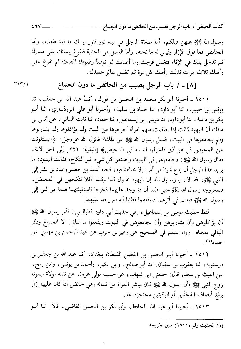 1501 - أَخْبَرَنَا أَبُو بَكْرٍ مُحَمَّدُ بْنُ الْحَسَنِ بْنِ فُورَكٍ أنبأ عَبْدُ اللهِ بْنُ جَعْفَرٍ، ثنا يُونُسُ بْنُ حَبِيبٍ، ثنا أَبُو دَاوُدَ، ثنا حَمَّادُ بْنُ سَلَمَةَ، وَأَخْبَرَنَا أَبُو عَلِيٍّ الرُّوذْبَارِيُّ، ثنا أَبُو بَكْرِ بْنُ دَاسَةَ، ثنا أَبُو دَاوُدَ ثنا مُوسَى بْنُ إِسْمَاعِيلَ، ثنا حَمَّادٌ، ثنا ثَابِتٌ الْبُنَانِيُّ، عَنْ أَنَسِ بْنِ مَالِكٍ، أَنَّ الْيَهُودَ كَانَتْ إِذَا حَاضَتْ مِنْهُمُ امْرَأَةٌ أَخْرَجُوهَا مِنَ الْبَيْتِ وَلَمْ يُؤَاكِلُوهَا وَلَمْ يُشَارِبُوهَا وَلَمْ يُجَامِعُوهَا فِي الْبَيْتِ فَسُئِلَ رَسُولُ اللهِ صَلَّى اللهُ عَلَيْهِ وَسَلَّمَ عَنْ ذَلِكَ فَأَنْزَلَ اللهُ عَزَّ وَجَلَّ {وَيَسْأَلُونَكَ عَنِ الْمَحِيضِ} [البقرة: 222] قُلْ هُوَ أَذًى فَاعْتَزِلُوا النِّسَاءَ فِي الْمَحِيضِ إِلَى آخِرِ الْآيَةِ فَقَالَ رَسُولُ اللهِ صَلَّى اللهُ عَلَيْهِ وَسَلَّمَ: §" جَامِعُوهُنَّ فِي الْبُيُوتِ وَاصْنَعُوا كُلَّ شَيْءٍ غَيْرَ النِّكَاحِ " فَقَالَتِ الْيَهُودُ: مَا يُرِيدُ هَذَا الرَّجُلُ أَنْ يَدَعَ شَيْئًا مِنْ أَمْرِنَا إِلَّا خَالَفَنَا فِيهِ، فَجَاءَ أُسَيْدُ بْنُ حُضَيْرٍ وَعَبَّادُ بْنُ بِشْرٍ إِلَى النَّبِيِّ صَلَّى اللهُ عَلَيْهِ وَسَلَّمَ فَقَالَا: يَا رَسُولَ اللهِ إِنَّ الْيَهُودَ تَقُولُ كَذَا وَكَذَا أَفَلَا نَنْكِحُهُنَّ فِي الْمَحِيضِ؟ فَتَمَعَّرَ وَجْهُ رَسُولِ اللهِ صَلَّى اللهُ عَلَيْهِ وَسَلَّمَ حَتَّى ظَنَنَّا أَنْ قَدْ وَجَدَ عَلَيْهِمَا فَخَرَجَا فَاسْتَقْبَلَتْهُمَا هَدِيَّةٌ مِنْ لَبَنٍ إِلَى رَسُولِ اللهِ صَلَّى اللهُ عَلَيْهِ وَسَلَّمَ فَبَعَثَ فِي أَثَرِهِمَا فَسَقَاهُمَا فَظَنَنَّا أَنَّهُ لَمْ يَجِدْ عَلَيْهِمَا " لَفْظُ حَدِيثِ مُوسَى بْنِ إِسْمَاعِيلَ وَفِي حَدِيثِ أَبِي دَاوُدَ الطَّيَالِسِيِّ فَأَمَرَ رَسُولُ اللهِ صَلَّى اللهُ عَلَيْهِ وَسَلَّمَ أَنْ يُؤَاكِلُوهُنَّ وَأَنْ يُشَارِبُوهُنَّ وَأَنْ يُجَامِعُوهُنَّ فِي الْبُيُوتِ وَيَفْعَلُوا مَا شَاءُوا إِلَّا الْجِمَاعَ وَذَكَرَ الْبَاقِي بِمَعْنَاهُ رَوَاهُ مُسْلِمٌ فِي الصَّحِيحِ عَنْ زُهَيْرِ بْنِ حَرْبٍ عَنْ عَبْدِ الرَّحْمَنِ بْنِ مَهْدِيٍّ عَنْ حَمَّادٍ