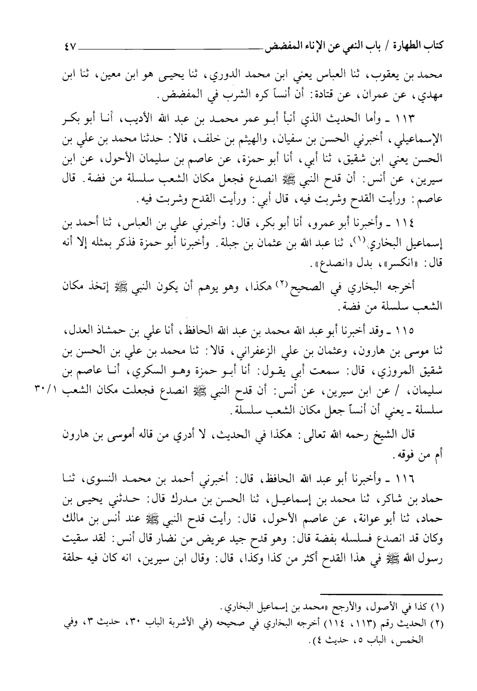 113 - وَأَمَّا الْحَدِيثُ الَّذِي أنبأ أَبُو عَمْرٍو مُحَمَّدُ بْنُ عَبْدِ اللهِ الْأَدِيبُ، أنا أَبُو بَكْرٍ الْإِسْمَاعِيلِيُّ، أَخْبَرَنِي الْحَسَنُ بْنُ سُفْيَانَ، وَالْهَيْثَمُ بْنُ خَلَفٍ، قَالَا: حَدَّثَنَا مُحَمَّدُ بْنُ عَلِيِّ بْنِ الْحَسَنِ يَعْنِي ابْنَ شَقِيقٍ، ثنا أَبِي، أنا أَبُو حَمْزَةَ، عَنْ عَاصِمِ بْنِ سُلَيْمَانَ الْأَحْوَلِ، عَنِ ابْنِ سِيرِينَ، عَنْ أَنَسٍ " أَنَّ §قَدَحَ النَّبِيِّ، صَلَّى اللهُ عَلَيْهِ وَسَلَّمَ انْصَدَعَ فَجَعَلَ مَكَانَ الشَّعِبِ سِلْسِلَةً مِنْ فِضَّةٍ ". قَالَ عَاصِمٌ: وَرَأَيْتُ الْقَدَحَ، وَشَرِبْتُ فِيهِ. قَالَ أَبِي: وَرَأَيْتُ الْقَدَحَ وَشَرِبْتُ فِيهِ