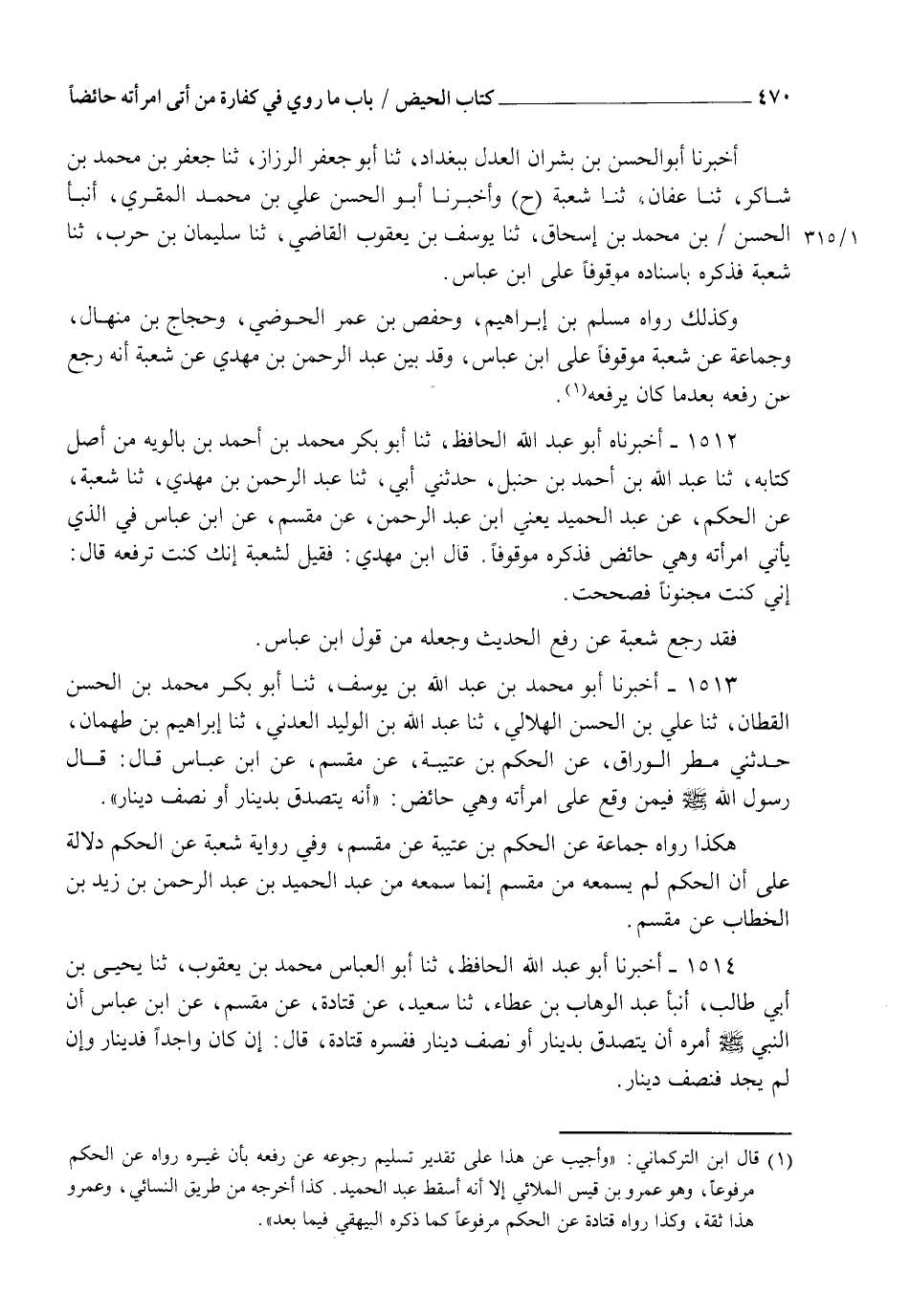 1513 - أَخْبَرَنَا أَبُو مُحَمَّدٍ عَبْدُ اللهِ بْنُ يُوسُفَ ثنا أَبُو بَكْرٍ مُحَمَّدُ بْنُ الْحَسَنِ الْقَطَّانُ، ثنا عَلِيُّ بْنُ الْحَسَنِ الْهِلَالِيُّ ثنا عَبْدُ اللهِ بْنِ الْوَلِيدِ الْعَدَنِيُّ ثنا إِبْرَاهِيمُ بْنُ طَهْمَانَ، حَدَّثَنِي مَطَرٌ الْوَرَّاقُ، عَنِ الْحَكَمِ بْنِ عُتَيْبَةَ، عَنْ مِقْسَمٍ، عَنِ ابْنِ عَبَّاسٍ، قَالَ: قَالَ رَسُولُ اللهِ صَلَّى اللهُ عَلَيْهِ وَسَلَّمَ فِيمَنْ وَقَعَ عَلَى امْرَأَتِهِ وَهِيَ حَائِضٌ أَنَّهُ §" يَتَصَدَّقُ بِدِينَارٍ أَوْ نِصْفِ دِينَارٍ هَكَذَا " رَوَاهُ جَمَاعَةٌ عَنِ الْحَكَمِ بْنِ عُتَيْبَةَ عَنْ مِقْسَمٍ وَفِي رِوَايَةِ شُعْبَةَ عَنِ الْحَكَمِ دَلَالَةٌ عَلَى أَنَّ الْحَكَمَ لَمْ يَسْمَعْهُ مِنْ مِقْسَمٍ إِنَّمَا سَمِعَهُ مِنْ عَبْدِ الْحَمِيدِ بْنِ عَبْدِ الرَّحْمَنِ بْنِ زَيْدَ بْنِ الْخَطَّابِ عَنْ مِقْسَمٍ