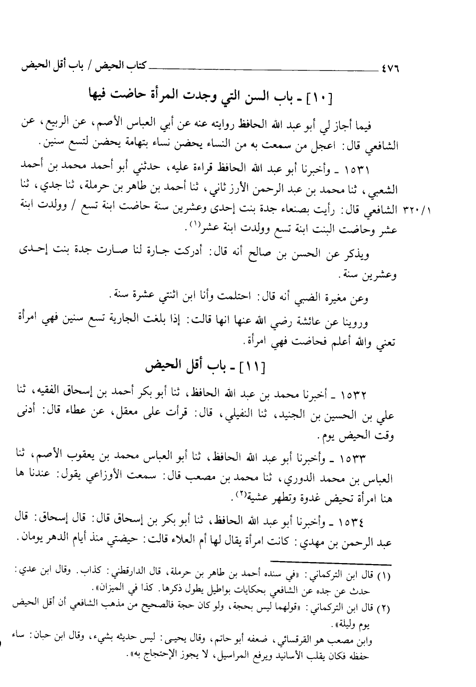 1531 - وَأَخْبَرَنَا أَبُو عَبْدِ اللهِ الْحَافِظُ قِرَاءَةً عَلَيْهِ حَدَّثَنِي أَبُو أَحْمَدَ مُحَمَّدُ بْنُ أَحْمَدَ الشَّعْبِيُّ، ثنا مُحَمَّدُ بْنُ عَبْدِ الرَّحْمَنِ الْأَرْزَنَانِيُّ ثنا أَحْمَدُ بْنُ طَاهِرِ بْنِ حَرْمَلَةَ ثنا جَدِّي ثنا الشَّافِعِيُّ، قَالَ: §" رَأَيْتُ بِصَنْعَاءَ جَدَّةً بِنْتَ إِحْدَى وَعِشْرِينَ سَنَةً حَاضَتِ ابْنَةَ تِسْعٍ وَوَلَدَتِ ابْنَةَ عَشْرٍ وَحَاضَتِ الْبِنْتُ ابْنَةَ تِسْعٍ وَوَلَدَتِ ابْنَةَ عَشْرٍ وَيُذْكَرُ عَنِ الْحَسَنِ بْنِ صَالِحٍ، أَنَّهُ قَالَ: أَدْرَكْتُ جَارَةً لَنَا صَارَتْ جَدَّةً بِنْتِ إِحْدَى وَعِشْرِينَ سَنَةً وَعَنْ مُغِيرَةَ الضَّبِّيِّ أَنَّهُ قَالَ: احْتَلَمْتُ وَأَنَا ابْنُ اثْنَتَيْ عَشْرَةَ سَنَةً وَرُوِّينَا عَنْ عَائِشَةَ رَضِيَ اللهُ عَنْهَا أَنَّهَا قَالَتْ: " إِذَا بَلَغَتِ الْجَارِيَةُ تِسْعَ سِنِينَ فَهِيَ امْرَأَةٌ " تَعْنِي وَاللهُ أَعْلَمُ فَحَاضَتْ فَهِيَ امْرَأَةٌ