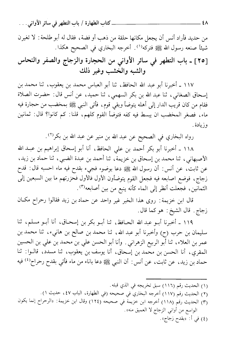 118 - أَخْبَرَنَا أَبُو بَكْرٍ أَحْمَدُ بْنُ عَلِيٍّ الْحَافِظُ، أنا أَبُو إِسْحَاقَ إِبْرَاهِيمُ بْنُ عَبْدِ اللهِ الْأَصْبَهَانِيُّ، ثنا مُحَمَّدُ بْنُ إِسْحَاقَ بْنِ خُزَيْمَةَ، ثنا أَحْمَدُ بْنُ عَبْدَةَ الضَّبِّيُّ، ثنا حَمَّادُ بْنُ زَيْدٍ، عَنْ ثَابِتٍ، عَنْ أَنَسٍ " أَنَّ رَسُولَ اللهِ صَلَّى اللهُ عَلَيْهِ وَسَلَّمَ §دَعَا بِوَضُوءٍ فَجِيئَ بِقَدَحٍ فِيهِ مَاءٌ أَحْسَبُهُ قَالَ: قَدَحِ زُجَاجٍ، فَوَضَعَ أَصَابِعَهُ فِيهِ، فَجَعَلَ الْقَوْمُ يَتَوَضَّئُونَ الْأَوَّلُ فَالْأَوَّلُ، فَحَزَرْتُهُمْ مَا بَيْنَ السَّبْعِينَ إِلَى الثَّمَانِينَ، فَجَعَلْتُ أَنْظُرُ إِلَى الْمَاءِ كَأَنَّهُ يَنْبُعُ مِنْ بَيْنِ أَصَابِعِهِ ". قَالَ ابْنُ خُزَيْمَةَ: رَوَى هَذَا الْخَبَرَ غَيْرُ وَاحِدٍ، عَنْ حَمَّادِ بْنِ زَيْدٍ، فَقَالُوا: رَحْرَاحٍ مَكَانَ زُجَاجٍ. قَالَ الشَّيْخُ: هُوَ كَمَا قَالَ