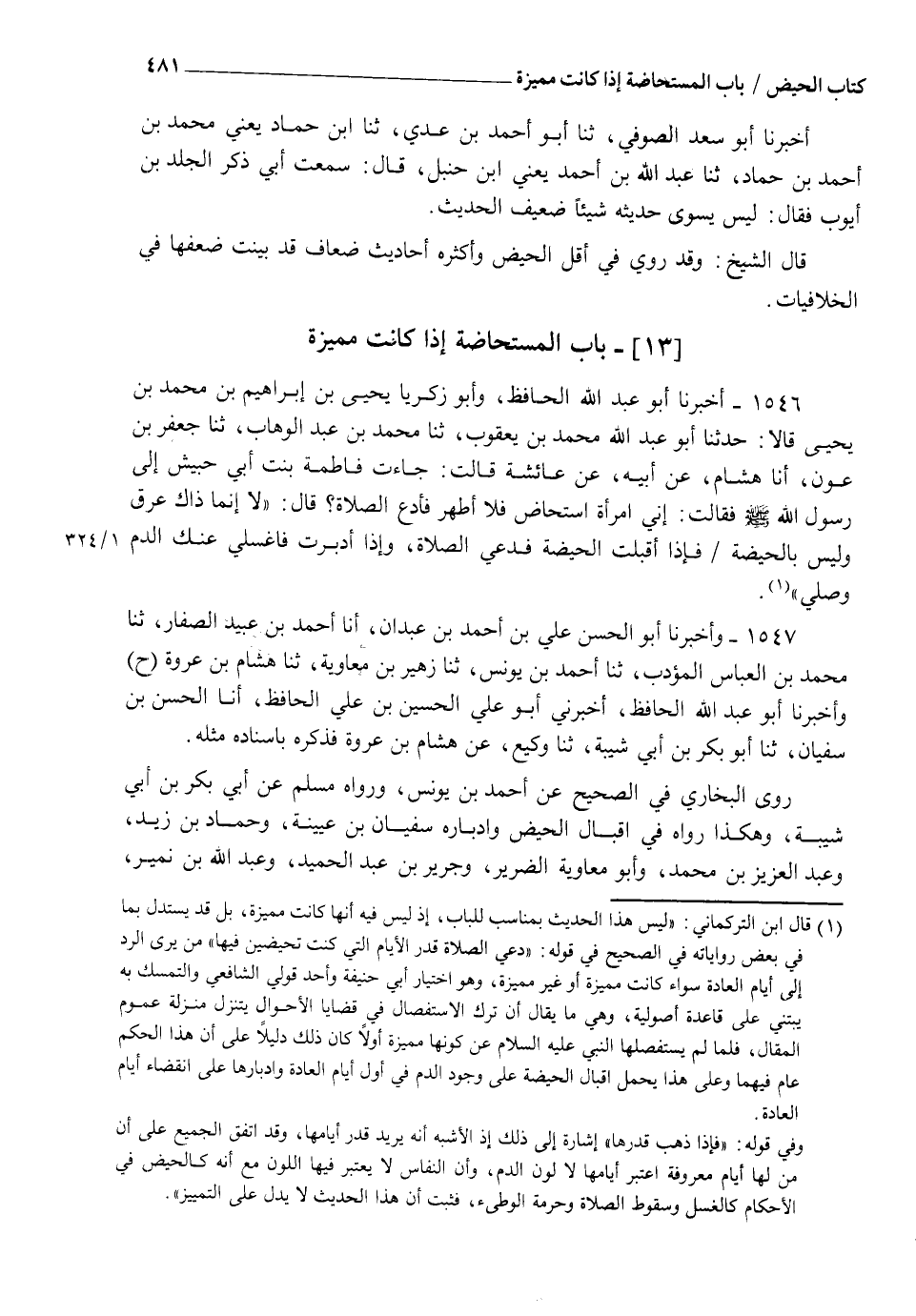 1547 - وَأَخْبَرَنَا أَبُو الْحَسَنِ عَلِيُّ بْنُ أَحْمَدَ بْنِ عَبْدَانَ أنا أَحْمَدُ بْنُ عُبَيْدٍ الصَّفَّارُ ثنا مُحَمَّدُ بْنُ الْعَبَّاسِ الْمُؤَدِّبُ ثنا أَحْمَدُ بْنُ يُونُسَ ثنا زُهَيْرُ بْنُ مُعَاوِيَةَ ثنا هِشَامُ بْنُ عُرْوَةَ، ح وَأَخْبَرَنَا أَبُو عَبْدِ اللهِ الْحَافِظُ، أَخْبَرَنِي أَبُو عَلِيٍّ الْحُسَيْنُ بْنُ عَلِيٍّ الْحَافِظُ، أنا الْحَسَنُ بْنُ سُفْيَانَ ثنا أَبُو بَكْرِ بْنُ أَبِي شَيْبَةَ ثنا وَكِيعٌ، عَنْ هِشَامِ بْنِ عُرْوَةَ، فَذَكَرَهُ بِإِسْنَادِهِ مِثْلَهُ رَوَى الْبُخَارِيُّ فِي الصَّحِيحِ عَنْ أَحْمَدَ بْنِ يُونُسَ، وَرَوَاهُ مُسْلِمٌ عَنْ أَبِي بَكْرِ بْنِ أَبِي شَيْبَةَ، وَهَكَذَا رَوَاهُ فِي إِقْبَالِ الْحَيْضِ وَإِدْبَارِهِ سُفْيَانُ بْنُ عُيَيْنَةَ وَحَمَّادُ بْنُ زَيْدٍ وَعَبْدُ الْعَزِيزِ بْنِ مُحَمَّدٍ وَأَبُو مُعَاوِيَةَ الضَّرِيرُ وَجَرِيرُ بْنُ عَبْدِ الْحَمِيدِ وَعَبْدُ اللهِ بْنُ نُمَيْرٍ -[482]- وَجَمَاعَةٌ كَبِيرَةٌ عَنْ هِشَامِ بْنِ عُرْوَةَ إِلَّا أَنَّ حَمَّادًا زَادَ فِيهِ الْوُضُوءَ وَابْنُ عُيَيْنَةَ زَادَ فِيهِ الِاغْتِسَالَ بِالشَّكِّ، وَرَوَاهُ مَالِكُ بْنُ أَنَسٍ الْإِمَامُ عَنْ هِشَامٍ وَقَالَ فِي الْحَدِيثِ فَإِذَا ذَهَبَ قَدْرُهَا فَاغْسِلِي عَنْكِ الدَّمَ وَصَلِّي