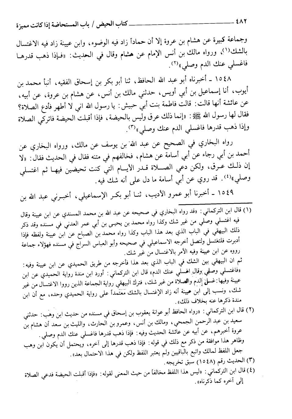 1550 - أَخْبَرَنَا أَبُو بَكْرِ بْنُ الْحَارِثِ الْفَقِيهُ، أنا عَلِيُّ بْنُ عُمَرَ الْحَافِظُ ثنا الْحُسَيْنُ بْنُ إِسْمَاعِيلَ ثنا ابْنُ كَرَامَةَ ثنا أَبُو أُسَامَةَ، عَنْ هِشَامِ بْنِ عُرْوَةَ، فَذَكَرَهُ وَقَالَ فِي الْحَدِيثِ: أَفَأَدَعُ الصَّلَاةَ؟ قَالَ: " لَيْسَ ذَلِكَ بِالْحَيْضِ إِنَّمَا ذَلِكَ عِرْقٌ فَإِذَا أَقْبَلَتِ الْحَيْضَةُ فَدَعِي الصَّلَاةَ وَإِذَا أَدْبَرَتْ فَاغْتَسِلِي وَصَلِّي " وَهَذَا أَوْلَى أَنْ يَكُونَ مَحْفُوظًا لِمُوَافَقَتِهِ رِوَايَةَ الْجَمَاعَةِ إِلَّا أَنَّهُ قَالَ: " فَاغْتَسِلِي " وَقَدْ قَالَهُ أَيْضًا ابْنُ عُيَيْنَةَ بِالشَّكِّ وَاللهُ أَعْلَمُ