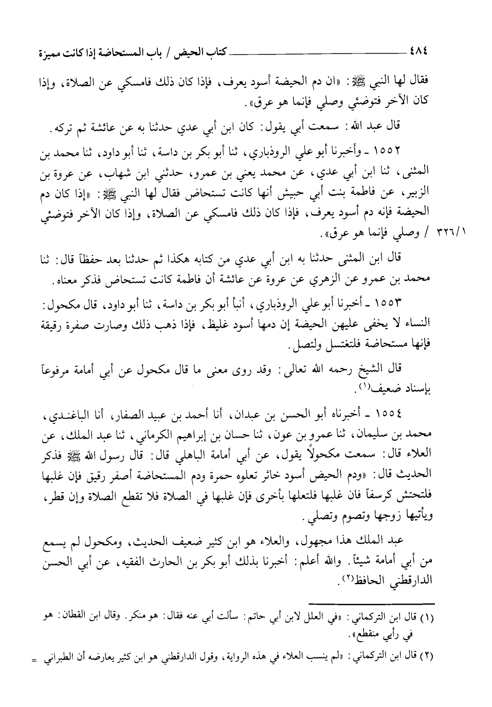1554 - أَخْبَرَنَاهُ أَبُو الْحَسَنِ بْنُ عَبْدَانَ، أنا أَحْمَدُ بْنُ عُبَيْدٍ الصَّفَّارُ، أنا الْبَاغَنْدِيُّ مُحَمَّدُ بْنُ سُلَيْمَانَ، ثنا عَمْرُو بْنُ عَوْنٍ ثنا حَسَّانُ بْنُ إِبْرَاهِيمَ الْكِرْمَانِيُّ ثنا عَبْدُ الْمَلِكِ، عَنِ الْعَلَاءِ، قَالَ: سَمِعْتُ مَكْحُولًا، يَقُولُ عَنْ أَبِي أُمَامَةَ الْبَاهِلِيِّ، قَالَ: قَالَ رَسُولُ اللهِ صَلَّى اللهُ عَلَيْهِ وَسَلَّمَ فَذَكَرَ الْحَدِيثَ قَالَ: §" وَدَمُ الْحَيْضِ أَسْوَدُ خَاثِرٌ تَعْلُوهُ حُمْرَةٌ وَدَمُ الْمُسْتَحَاضَةِ أَصْفَرُ رَقِيقٌ فَإِنْ غَلَبَهَا فَلْتَحْتَشِ كُرْسُفًا فَإِنْ غَلَبَهَا فَلْتُعْلِهَا بِأُخْرَى فَإِنْ غَلَبَهَا فِي الصَّلَاةِ فَلَا تَقْطَعِ الصَّلَاةَ وَإِنْ قَطَرَ وَيَأْتِيهَا زَوْجُهَا وَتَصُومُ وَتُصَلِّي عَبْدُ الْمَلِكِ هَذَا مَجْهُولٌ وَالْعَلَاءُ هُوَ ابْنُ كَثِيرٍ ضَعِيفُ الْحَدِيثِ وَمَكْحُولٌ لَمْ يَسْمَعْ مِنْ أَبِي أُمَامَةَ شَيْئًا وَاللهُ أَعْلَمُ أَخْبَرَنَا بِذَلِكَ أَبُو بَكْرِ بْنُ الْحَارِثِ الْفَقِيهُ عَنْ أَبِي الْحَسَنِ الدَّارَقُطْنِيِّ الْحَافِظِ