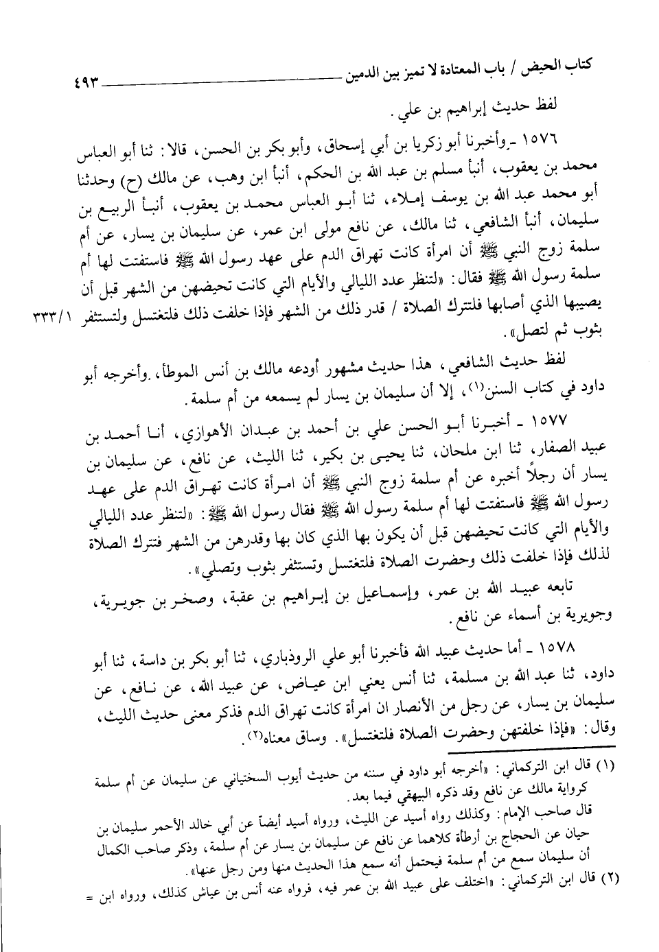 1577 - أَخْبَرَنَا أَبُو الْحَسَنِ عَلِيُّ بْنُ أَحْمَدَ بْنِ عَبْدَانَ الْأَهْوَازِيُّ أنا أَحْمَدُ بْنُ عُبَيْدٍ الصَّفَّارُ ثنا ابْنُ مِلْحَانَ ثنا يَحْيَى بْنُ بُكَيْرٍ ثنا اللَّيْثُ، عَنْ نَافِعٍ، عَنْ سُلَيْمَانَ بْنِ يَسَارٍ، أَنَّ رَجُلًا، أَخْبَرَهُ عَنْ أُمِّ سَلَمَةَ زَوْجِ النَّبِيِّ صَلَّى اللهُ عَلَيْهِ وَسَلَّمَ أَنَّ §امْرَأَةً كَانَتْ تُهَرَاقُ الدَّمَ عَلَى عَهْدِ رَسُولِ اللهِ صَلَّى اللهُ عَلَيْهِ وَسَلَّمَ فَاسْتَفْتَتْ لَهَا أُمُّ سَلَمَةَ رَسُولَ اللهِ صَلَّى اللهُ عَلَيْهِ وَسَلَّمَ فَقَالَ رَسُولُ اللهِ صَلَّى اللهُ عَلَيْهِ وَسَلَّمَ: " لِتَنْظُرْ عَدَدَ اللَّيَالِي وَالْأَيَّامِ الَّتِي كَانَتْ تَحِيضُهُنَّ قَبْلَ أَنْ يَكُونَ بِهَا الَّذِي كَانَ بِهَا وَقَدْرَهُنَّ مِنَ الشَّهْرِ فَتُتْرَكِ الصَّلَاةَ لِذَلِكَ فَإِذَا خَلَّفَتْ ذَلِكَ وَحَضَرَتِ الصَّلَاةُ فَلْتَغْتَسِلْ وَتَسْتَثْفِرْ بِثَوْبٍ وَتُصَلِّي " تَابَعَهُ عُبَيْدُ اللهِ بْنُ عُمَرَ وَإِسْمَاعِيلُ بْنُ إِبْرَاهِيمَ بْنِ عُقْبَةَ وَصَخْرُ بْنُ جُوَيْرِيَةَ وَجُوَيْرِيَةُ بْنُ أَسْمَاءَ عَنْ نَافِعٍ