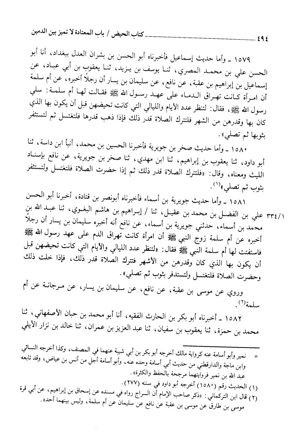 1582 - أَخْبَرَنَاهُ أَبُو بَكْرِ بْنُ الْحَارِثِ الْفَقِيهُ أنا أَبُو مُحَمَّدِ بْنُ حَبَّانَ الْأَصْفَهَانِيُّ ثنا مُحَمَّدُ بْنُ حَمْزَةَ ثنا يَعْقُوبُ بْنُ سُفْيَانَ ثنا عَبْدُ الْعَزِيزِ بْنُ عِمْرَانَ ثنا خَالِدُ بْنُ نِزَارِ الْأَيْلِيُّ، -[495]- وَكَانَ ثِقَةً ثنا إِبْرَاهِيَمُ بْنُ طَهْمَانَ، وَهُوَ ثَبْتٌ فِي الْحَدِيثِ حَدَّثَنَا مُوسَى بْنُ عُقْبَةَ، وَهُوَ مِنَ الثِّقَاتِ وَكَانَ مَالِكٌ يُمْلِي عَلَيْهِ، ثنا نَافِعٌ، عَنْ سُلَيْمَانَ بْنِ يَسَارٍ، عَنْ مَرْجَانَةَ، عَنْ أُمِّ سَلَمَةَ سَأَلْتُ رَسُولَ اللهِ صَلَّى اللهُ عَلَيْهِ وَسَلَّمَ فَقَالَ: §" لِتَنْظُرْ عَدَدَ اللَّيَالِي وَالْأَيَّامِ الَّتِي كَانَتْ تَحِيضُهُنَّ قَبْلَ أَنْ يَكُونَ لَهَا الَّذِي كَانَ وَقَدْرَهُنَّ مِنَ الشَّهْرِ فَلْتَتْرُكِ الصَّلَاةَ قَدْرَ ذَلِكَ فَإِذَا ذَهَبَ قَدْرُهَا فَلْتَغْتَسِلْ وَلْتَسْتَدْفِرْ بِثَوْبِهَا وَتُصَلِّي " وَرَوَاهُ أَيُّوبُ السَّخْتِيَانِيُّ، عَنْ سُلَيْمَانَ بْنِ يَسَارٍ، عَنْ أُمِّ سَلَمَةَ إِلَّا أَنَّهُ سَمَّى الْمُسْتَحَاضَةَ فِي الْحَدِيثِ فَقَالَ: فَاطِمَةُ بِنْتُ أَبِي حُبَيْشٍ