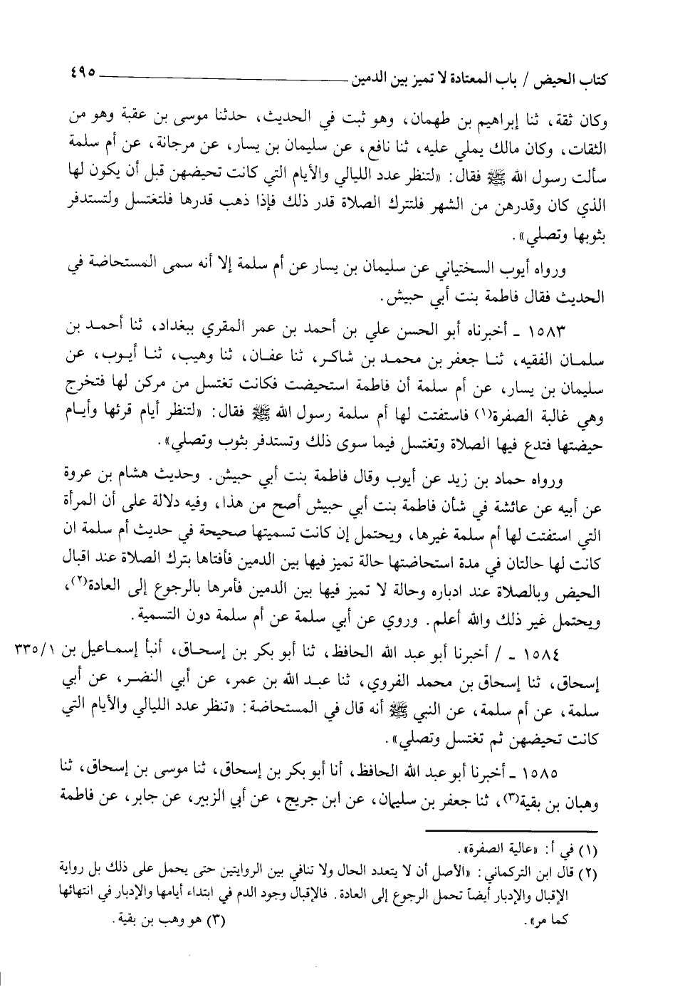 1583 - أَخْبَرَنَاهُ أَبُو الْحَسَنِ عَلِيُّ بْنُ أَحْمَدَ بْنُ عُمَرَ الْمُقْرِئُ بِبَغْدَادَ، ثنا أَحْمَدُ بْنُ سَلْمَانَ الْفَقِيهُ ثنا جَعْفَرُ بْنُ مُحَمَّدِ بْنِ شَاكِرٍ ثنا عَفَّانُ ثنا وَهَيْبٌ ثنا أَيُّوبُ عَنْ سُلَيْمَانَ بْنِ يَسَارٍ عَنْ أُمِّ سَلَمَةَ، أَنَّ فَاطِمَةَ اسْتُحِيضَتْ فَكَانَتْ تَغْتَسِلُ مِنْ مِرْكَنٍ لَهَا فَتَخْرُجُ وَهِيَ غَالِبَةُ الصُّفْرَةِ فَاسْتَفْتَتْ لَهَا أُمُّ سَلَمَةَ رَسُولُ اللهِ صَلَّى اللهُ عَلَيْهِ وَسَلَّمَ فَقَالَ: §" لِتَنْظُرْ أَيَّامَ قُرْئِهَا وَأَيَّامَ حَيْضَتِهَا فَتَدَعُ فِيهَا الصَّلَاةَ وَتَغْتَسِلُ فِيمَا سِوَى ذَلِكَ وَتَسْتَدْفِرُ بِثَوْبٍ وَتُصَلِّي " وَرَوَاهُ حَمَّادُ بْنُ زَيْدٍ، عَنْ أَيُّوبَ وَقَالَ: فَاطِمَةُ بِنْتُ أَبِي حُبَيْشٍ وَحَدِيثُ هِشَامِ بْنِ عُرْوَةَ، عَنْ أَبِيهِ، عَنْ عَائِشَةَ فِي شَأْنِ فَاطِمَةَ بِنْتِ أَبِي حُبَيْشٍ أَصَحُّ مِنْ هَذَا وَفِيهِ دَلَالَةٌ عَلَى أَنَّ الْمَرْأَةَ الَّتِي اسْتَفْتَتْ لَهَا أُمُّ سَلَمَةَ غَيْرُهَا وَيُحْتَمَلُ إِنْ كَانَتْ تَسْمِيَتُهَا صَحِيحَةً فِي حَدِيثِ أُمِّ سَلَمَةَ إِنْ كَانَتْ لَهَا حَالَتَانِ فِي مُدَّةِ اسْتِحَاضَتِهَا حَالَةٌ تُمَيِّزُ فِيهَا بَيْنَ الدَّمَيْنِ فَأَفْتَاهَا بِتَرْكِ الصَّلَاةِ عِنْدَ إِقْبَالِ الْحَيْضِ وَبِالصَّلَاةِ عِنْدَ إِدْبَارِهِ وَحَالَةٌ لَا تُمَيِّزُ فِيهَا بَيْنَ الدَّمَيْنِ فَأَمَرَهَا بِالرُّجُوعِ إِلَى الْعَادَةَ وَيُحْتَمَلُ غَيْرُ ذَلِكَ وَاللهُ أَعْلَمُ وَرُوِيَ، عَنْ أَبِي سَلَمَةَ، عَنْ أُمِّ سَلَمَةَ دُونَ التَّسْمِيَةِ