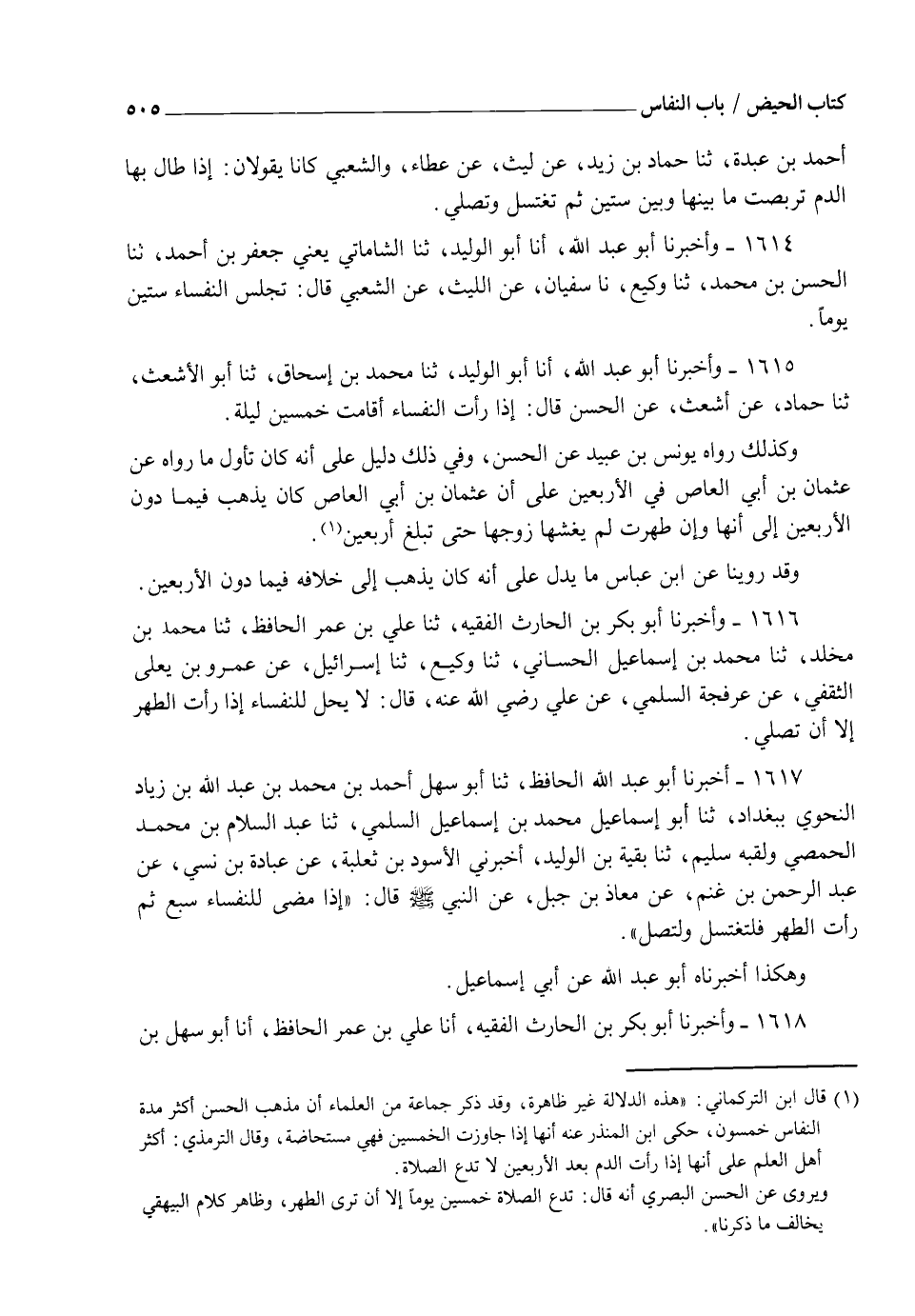 1615 - وَأَخْبَرَنَا أَبُو عَبْدِ اللهِ، أنا أَبُو الْوَلِيدِ ثنا مُحَمَّدُ بْنُ إِسْحَاقَ ثنا أَبُو الْأَشْعَثِ ثنا حَمَّادُ عَنْ أَشْعَثَ، عَنِ الْحَسَنِ، قَالَ: §" إِذَا رَأَتِ النُّفَسَاءُ أَقَامَتْ خَمْسِينَ لَيْلَةً " وَكَذَلِكَ رَوَاهُ يُونُسُ بْنُ عُبَيْدٍ عَنِ الْحَسَنِ وَفِي ذَلِكَ دَلِيلٌ عَلَى أَنَّهُ كَانَ تَأَوَّلَ مَا رَوَاهُ عَنْ عُثْمَانَ بْنِ أَبِي الْعَاصِ فِي الْأَرْبَعِينَ عَلَى أَنَّ عُثْمَانَ بْنَ أَبِي الْعَاصِ كَانَ يَذْهَبُ فِيمَا دُونَ الْأَرْبَعِينَ إِلَى أَنَّهَا وَإِنْ طَهُرَتْ لَمْ يَغْشَهَا زَوْجُهَا حَتَّى تَبْلُغَ أَرْبَعِينَ وَقَدْ رُوِّينَا عَنِ ابْنِ عَبَّاسٍ مَا يَدُلُّ عَلَى أَنَّهُ كَانَ يَذْهَبُ إِلَى خِلَافِهِ فِيمَا دُونَ الْأَرْبَعِينَ