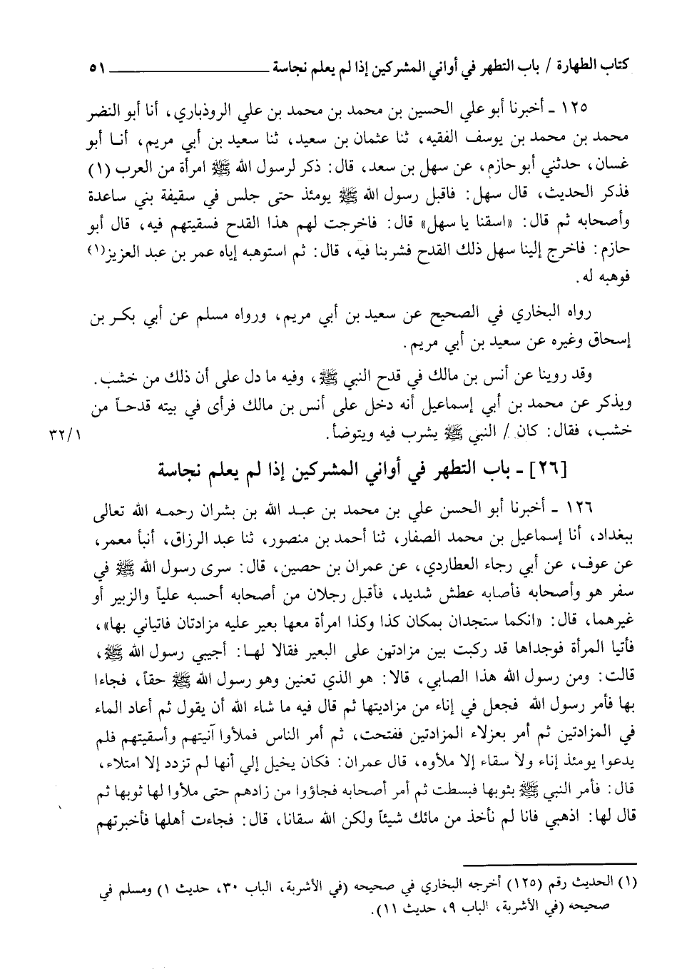 125 - أَخْبَرَنَا أَبُو عَلِيٍّ الْحُسَيْنُ بْنُ مُحَمَّدِ بْنِ مُحَمَّدِ بْنِ عَلِيٍّ الرُّوذْبَارِيُّ، أنا أَبُو النَّضْرِ مُحَمَّدُ بْنُ مُحَمَّدِ بْنِ يُوسُفَ الْفَقِيهُ، ثنا عُثْمَانُ بْنُ سَعِيدٍ، ثنا سَعِيدُ بْنُ أَبِي مَرْيَمَ، أنا أَبُو غَسَّانَ، حَدَّثَنِي أَبُو حَازِمٍ، عَنْ سَهْلِ بْنِ سَعْدٍ، قَالَ: ذُكِرَ لِرَسُولِ اللهِ صَلَّى اللهُ عَلَيْهِ وَسَلَّمَ امْرَأَةٌ مِنَ الْعَرَبِ، فَذَكَرَ الْحَدِيثَ. قَالَ سَهْلٌ: فَأَقْبَلَ رَسُولُ اللهِ صَلَّى اللهُ عَلَيْهِ وَسَلَّمَ يَوْمَئِذٍ حَتَّى جَلَسَ فِي سَقِيفَةِ بَنِي سَاعِدَةَ وَأَصْحَابُهُ، ثُمَّ قَالَ: " §اسْقِنَا يَا سَهْلُ ". قَالَ: فَأَخْرَجْتُ لَهُمْ هَذَا الْقَدَحَ فَسَقَيْتُهُمْ فِيهِ. قَالَ أَبُو حَازِمٍ: فَأَخْرَجَ إِلَيْنَا سَهْلٌ ذَلِكَ الْقَدَحَ فَشَرِبْنَا فِيهِ. قَالَ: ثُمَّ اسْتَوْهَبَهُ إِيَّاهُ عُمَرُ بْنُ عَبْدِ الْعَزِيزِ، فَوَهَبَهُ لَهُ رَوَاهُ الْبُخَارِيُّ فِي الصَّحِيحِ، عَنْ سَعِيدِ بْنِ أَبِي مَرْيَمَ، وَرَوَاهُ مُسْلِمٌ، عَنْ أَبِي بَكْرِ بْنِ إِسْحَاقَ وَغَيْرِهِ، عَنْ سَعِيدِ بْنِ أَبِي مَرْيَمَ. وَقَدْ رُوِّينَا، عَنْ أَنَسِ بْنِ مَالِكٍ فِي قَدَحِ النَّبِيِّ صَلَّى اللهُ عَلَيْهِ وَسَلَّمَ، وَفِيهِ مَا دَلَّ عَلَى أَنَّ ذَلِكَ مِنْ خَشَبٍ، وَيُذْكَرُ عَنْ مُحَمَّدِ بْنِ أَبِي إِسْمَاعِيلَ أَنَّهُ دَخَلَ عَلَى أَنَسِ بْنِ مَالِكٍ فَرَأَى فِي بَيْتِهِ قَدَحًا مِنْ خَشَبٍ فَقَالَ: " كَانَ النَّبِيُّ صَلَّى اللهُ عَلَيْهِ وَسَلَّمَ يَشْرَبُ فِيهِ وَيَتَوَضَّأُ "