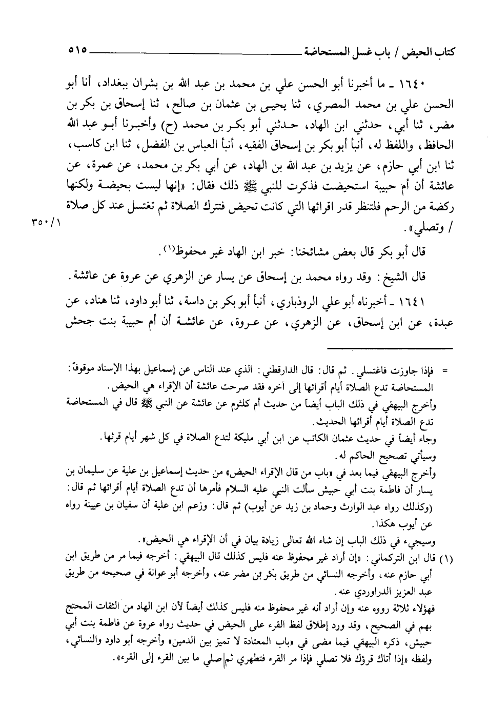 1640 - مَا أَخْبَرَنَا أَبُو الْحُسَيْنِ عَلِيُّ بْنُ مُحَمَّدِ بْنِ عَبْدِ اللهِ بْنِ بِشْرَانَ بِبَغْدَادَ، أنا أَبُو الْحَسَنِ عَلِيُّ بْنُ مُحَمَّدٍ الْمِصْرِيُّ، ثنا يَحْيَى بْنُ عُثْمَانَ بْنِ صَالِحٍ ثنا إِسْحَاقُ بْنُ بَكْرِ بْنِ مُضَرٍ ثنا أَبِي، حَدَّثَنِي ابْنُ الْهَادِ، حَدَّثَنِي أَبُو بَكْرِ بْنُ مُحَمَّدٍ، ح وَأَخْبَرَنَا أَبُو عَبْدِ اللهِ الْحَافِظُ، وَاللَّفْظُ لَهُ أنبأ أَبُو بَكْرِ بْنُ إِسْحَاقَ الْفَقِيهُ، أنبأ الْعَبَّاسُ بْنُ الْفَضْلِ، ثنا ابْنُ كَاسِبٍ، ثنا ابْنُ أَبِي حَازِمٍ، عَنْ يَزِيدَ بْنِ عَبْدِ اللهِ بْنِ الْهَادِ، عَنْ أَبِي بَكْرِ بْنِ مُحَمَّدٍ، عَنْ عَمْرَةَ، عَنْ عَائِشَةَ، أَنَّ أُمَّ حَبِيبَةَ اسْتُحِيضَتْ فَذَكَرَتْ لِلنَّبِيِّ صَلَّى اللهُ عَلَيْهِ وَسَلَّمَ ذَلِكَ فَقَالَ: §" إِنَّهَا لَيْسَتْ بِحَيْضَةٍ وَلَكِنَّهَا رَكْضَةٌ مِنَ الرَّحِمِ فَلْتَنْظُرْ قَدْرَ أَقْرَائِهَا الَّتِي كَانَتْ تَحِيضُ فَتُتْرَكِ الصَّلَاةَ ثُمَّ تَغْتَسِلُ عِنْدَ كُلِّ صَلَاةٍ وَتُصَلِّي " قَالَ أَبُو بَكْرٍ: قَالَ بَعْضُ مَشَائِخِنَا خَبَرُ ابْنُ الْهَادِ غَيْرُ مَحْفُوظٍ قَالَ الشَّيْخُ: وَقَدْ رَوَاهُ مُحَمَّدُ بْنُ إِسْحَاقَ، عَنْ يَسَارٍ عَنِ الزُّهْرِيِّ، عَنْ عُرْوَةَ، عَنْ عَائِشَةَ