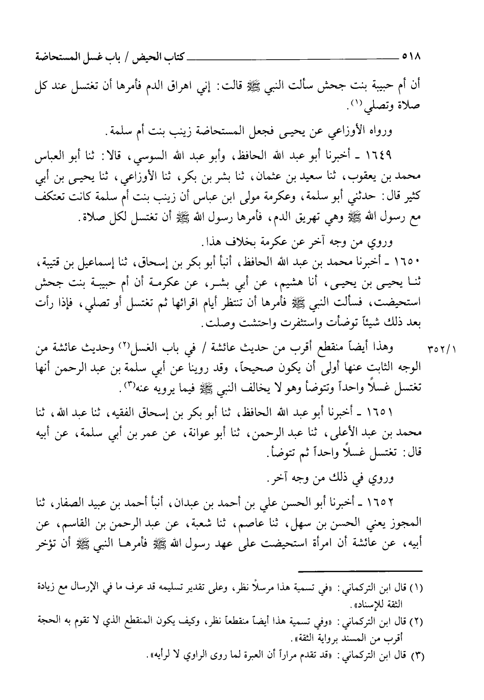1650 - أَخْبَرَنَا مُحَمَّدُ بْنُ عَبْدِ اللهِ الْحَافِظُ، أنبأ أَبُو بَكْرِ بْنُ إِسْحَاقَ ثنا إِسْمَاعِيلُ بْنُ قُتَيْبَةَ ثنا يَحْيَى بْنُ يَحْيَى، أنا هُشَيْمٌ عَنْ أَبِي بِشْرٍ، عَنْ عِكْرِمَةَ، أَنَّ أُمَّ حَبِيبَةَ بِنْتَ جَحْشٍ اسْتُحِيضَتْ فَسَأَلْتِ النَّبِيَّ صَلَّى اللهُ عَلَيْهِ وَسَلَّمَ §فَأَمَرَهَا أَنْ تَنْتَظِرَ أَيَّامَ أَقْرَائِهَا ثُمَّ تَغْتَسِلَ أَوْ تُصَلِّيَ فَإِذَا رَأَتْ بَعْدَ ذَلِكَ شَيْئًا تَوَضَّأَتْ وَاسْتَثْفَرَتْ وَاحْتَشَتْ وَصَلَّتْ " وَهَذَا أَيْضًا مُنْقَطِعٌ أَقْرَبُ مِنْ حَدِيثِ عَائِشَةَ فِي بَابِ الْغُسْلِ وَحَدِيثُ عَائِشَةَ مِنَ الْوَجْهِ الثَّابِتِ عَنْهَا أَوْلَى أَنْ يَكُونَ صَحِيحًا وَقَدْ رُوِّينَا عَنْ أَبِي سَلَمَةَ بْنِ عَبْدِ الرَّحْمَنِ أَنَّهَا تَغْتَسِلُ غُسْلًا وَاحِدًا وَتَتَوَضَّأُ وَهُوَ لَا يُخَالِفُ النَّبِيَّ صَلَّى اللهُ عَلَيْهِ وَسَلَّمَ فِيمَا يَرْوِيهِ عَنْهُ