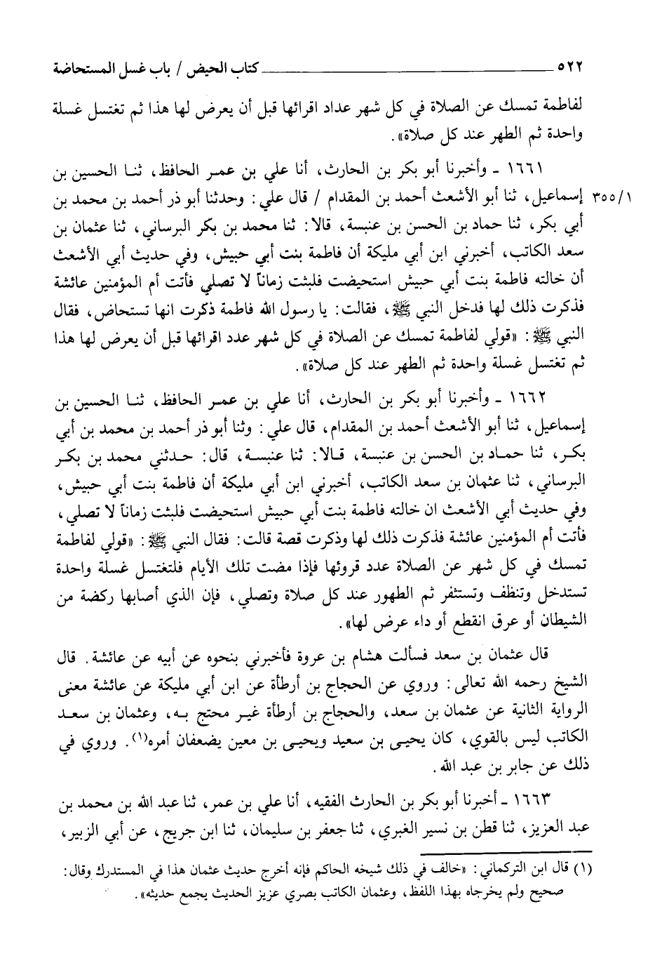 1662 - وَأَخْبَرَنَا أَبُو بَكْرِ بْنُ الْحَارِثِ، أنا عَلِيُّ بْنُ عُمَرَ الْحَافِظُ ثنا الْحُسَيْنُ بْنُ إِسْمَاعِيلَ ثنا أَبُو الْأَشْعَثِ أَحْمَدُ بْنُ الْمِقْدَامِ قَالَ عَلِيٌّ: وَثَنَا أَبُو ذَرٍّ أَحْمَدُ بْنُ مُحَمَّدِ بْنِ أَبِي بَكْرٍ، ثنا حَمَّادُ بْنُ الْحَسَنِ بْنِ عَنْبَسَةَ قَالَا: ثنا، عَنْبَسَةُ، قَالَ: حَدَّثَنِي مُحَمَّدُ بْنُ بَكْرٍ الْبُرْسَانِيُّ ثنا عُثْمَانُ بْنُ سَعْدٍ الْكَاتِبُ، أَخْبَرَنِي ابْنُ أَبِي مُلَيْكَةَ، أَنَّ فَاطِمَةَ بِنْتَ أَبِي حُبَيْشٍ، وَفِي حَدِيثِ أَبِي الْأَشْعَثِ أَنَّ خَالَتَهُ فَاطِمَةَ بِنْتَ أَبِي حُبَيْشٍ اسْتُحِيضَتْ فَلَبِثَتْ زَمَانًا لَا تُصَلِّي فَأَتَتْ أُمَّ الْمُؤْمِنِينَ عَائِشَةَ فَذَكَرَتْ ذَلِكَ لَهَا وَذَكَرَتْ قِصَّةً قَالَتْ: فَقَالَ النَّبِيُّ صَلَّى اللهُ عَلَيْهِ وَسَلَّمَ: §" قُولِي لِفَاطِمَةَ تُمْسِكُ فِي كُلِّ شَهْرٍ عَنِ الصَّلَاةِ عَدَدَ قُرُوئِهَا فَإِذَا مَضَتْ تِلْكَ الْأَيَّامُ فَلْتَغْتَسِلْ غَسْلَةً وَاحِدَةً تَسْتَدْخِلُ وَتُنَظِّفُ وَتَسْتَثْفِرُ ثُمَّ الطُّهُورُ عِنْدَ كُلِّ صَلَاةٍ وَتُصَلِّي فَإِنَّ الَّذِي أَصَابَهَا رَكْضَةٌ مِنَ الشَّيْطَانِ أَوْ عِرْقٌ انْقَطَعَ أَوْ دَاءٌ عَرَضَ لَهَا " قَالَ عُثْمَانُ بْنُ سَعْدٍ: فَسَأَلْتُ هِشَامَ بْنَ عُرْوَةَ فَأَخْبَرَنِي بِنَحْوِهِ، عَنْ أَبِيهِ، عَنْ عَائِشَةَ قَالَ الشَّيْخُ رَحِمَهُ اللهُ تَعَالَى: وَرُوِيَ عَنِ الْحَجَّاجِ بْنِ أَرْطَاةَ عَنِ ابْنِ أَبِي مُلَيْكَةَ، عَنْ عَائِشَةَ مَعْنَى الرِّوَايَةِ الثَّانِيَةِ عَنْ عُثْمَانَ بْنِ سَعْدٍ، وَالْحَجَّاجُ بْنُ أَرْطَاةَ غَيْرُ مُحْتَجٍّ بِهِ وَعُثْمَانُ بْنُ سَعْدٍ الْكَاتِبُ لَيْسَ بِالْقَوِيِّ، كَانَ يَحْيَى بْنُ سَعِيدٍ وَيَحْيَى بْنُ مَعِينٍ يُضَعَّفَانِ أَمْرَهُ، وَرُوِيَ فِي ذَلِكَ عَنْ جَابِرِ بْنِ عَبْدِ اللهِ