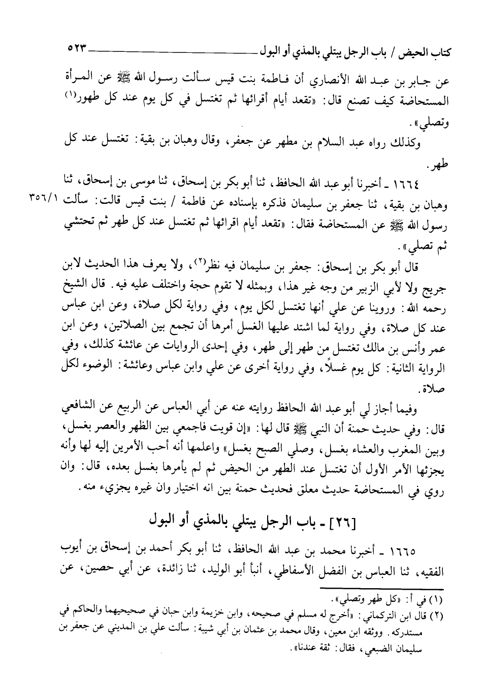 1664 - أَخْبَرَنَا أَبُو عَبْدِ اللهِ الْحَافِظُ ثنا أَبُو بَكْرِ بْنُ إِسْحَاقَ ثنا مُوسَى بْنُ إِسْحَاقَ ثنا وَهْبُ بْنُ بَقِيَّةَ ثنا جَعْفَرُ بْنُ سُلَيْمَانَ، فَذَكَرَهُ بِإِسْنَادِهِ، عَنْ فَاطِمَةَ بِنْتِ قَيْسٍ، قَالَتْ: سَأَلْتُ رَسُولَ اللهِ صَلَّى اللهُ عَلَيْهِ وَسَلَّمَ عَنِ الْمُسْتَحَاضَةِ فَقَالَ: §" تَقْعُدُ أَيَّامَ أَقْرَائِهَا ثُمَّ تَغْتَسِلُ عِنْدَ كُلِّ طُهْرٍ ثُمَّ تَحْتَشِي ثُمَّ تُصَلِّي " قَالَ أَبُو بَكْرِ بْنُ إِسْحَاقَ: جَعْفَرُ بْنُ سُلَيْمَانَ فِيهِ نَظَرٌ وَلَا يُعْرَفُ هَذَا الْحَدِيثُ لِابْنِ جُرَيْجٍ وَلَا لِأَبِي الزُّبَيْرِ مِنْ وَجْهٍ غَيْرِ هَذَا وَبِمِثْلِهِ لَا تَقُومُ حُجَّةٌ وَاخْتُلِفَ عَلَيْهِ فِيهِ قَالَ الشَّيْخُ رَحِمَهُ اللهُ: وَرُوِّينَا عَنْ عَلِيٍّ أَنَّهَا تَغْتَسِلُ لِكُلِّ يَوْمٍ وَفِي رِوَايَةٍ لِكُلِّ صَلَاةٍ وَعَنِ ابْنِ عَبَّاسٍ: عِنْدَ كُلِّ صَلَاةٍ وَفِي رِوَايَةٍ لَمَّا اشْتَدَّ عَلَيْهَا الْغُسْلُ أَمَرَهَا أَنْ تَجْمَعَ بَيْنَ الصَّلَاتَيْنِ وَعَنِ ابْنِ عُمَرَ وَأَنَسِ بْنِ مَالِكٍ تَغْتَسِلُ مِنْ طُهْرٍ إِلَى طُهْرٍ وَفِي إِحْدَى الرِّوَايَاتِ عَنْ عَائِشَةَ كَذَلِكَ، وَفِي الرِّوَايَةِ الثَّانِيَةِ كُلَّ يَوْمٍ غُسْلًا، وَفِي رِوَايَةٍ أُخْرَى عَنْ عَلِيٍّ وَابْنِ عَبَّاسٍ وَعَائِشَةَ الْوُضُوءُ لِكُلِّ صَلَاةٍ وَفِيمَا أَجَازَ لِي أَبُو عَبْدِ اللهِ الْحَافِظُ رِوَايَتَهُ عَنْهُ عَنْ أَبِي الْعَبَّاسِ عَنِ الرَّبِيعِ عَنِ الشَّافِعِيِّ قَالَ: وَفِي حَدِيثِ حَمْنَةُ أَنَّ النَّبِيَّ صَلَّى اللهُ عَلَيْهِ وَسَلَّمَ قَالَ لَهَا: " إِنْ قَوِيتِ فَاجْمَعِي بَيْنَ الظُّهْرِ وَالْعَصْرِ بِغُسْلٍ وَبَيْنَ الْمَغْرِبِ وَالْعِشَاءِ بِغُسْلٍ وَصَلِّي الصُّبْحَ بِغُسْلٍ " وَأَعْلَمَهَا أَنَّهُ أَحَبُّ الْأَمْرَيْنِ إِلَيْهِ لَهَا وَأَنَّهُ يُجْزِئُهَا الْأَمْرُ الْأَوَّلُ أَنْ تَغْتَسِلَ عِنْدَ الطُّهْرِ مِنَ الْحَيْضِ ثُمَّ لَمْ يَأْمُرْهَا بِغُسْلٍ بَعْدَهُ قَالَ: وَإِنْ رُوِيَ فِي الْمُسْتَحَاضَةِ حَدِيثٌ مُعَلَّقٌ فَحَدِيثُ حَمْنَةَ بَيَّنَ أَنَّهُ اخْتِيَارٌ وَأَنَّ غَيْرَهُ يُجْزِئُ مِنْهُ