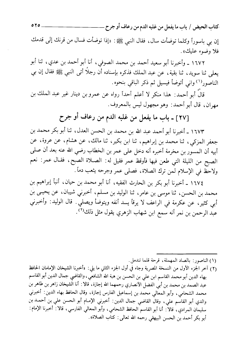 1674 - أَخْبَرَنَا أَبُو بَكْرِ بْنُ الْحَارِثِ الْفَقِيهُ، أنا أَبُو مُحَمَّدِ بْنُ حَيَّانَ، أنبأ إِبْرَاهِيمُ بْنُ مُحَمَّدِ بْنِ الْحَسَنِ ثنا مُوسَى بْنُ عَامِرٍ ثنا الْوَلِيدُ بْنُ مُسْلِمٍ، أَخْبَرَنِي شَيْبَانُ عَنْ يَحْيَى بْنِ أَبِي كَثِيرٍ عَنْ عِكْرِمَةَ، فِي الرَّاعِفِ §لَا يَرْقَأُ يَسُدُّ أَنْفَهُ وَيَتَوَضَّأُ وَيُصَلِّي قَالَ الْوَلِيدُ: وَأَخْبَرَنِي عَبْدُ الرَّحْمَنِ بْنُ نَمِرٍ أَنَّهُ سَمِعَ ابْنَ شِهَابٍ الزُّهْرِيَّ يَقُولُ مِثْلَ ذَلِكَ