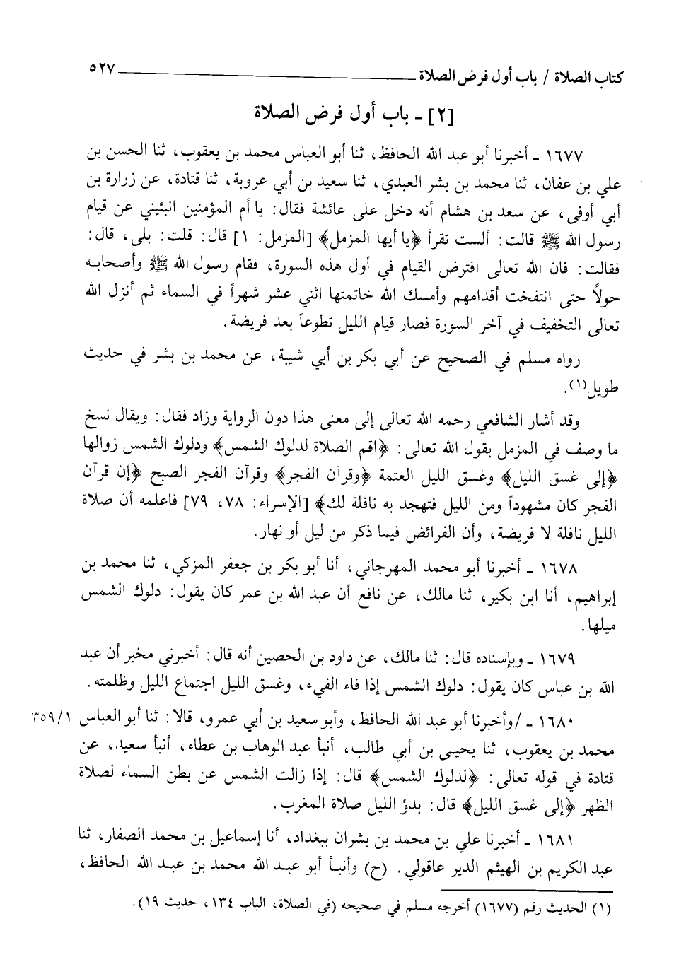 1677 - أَخْبَرَنَا أَبُو عَبْدِ اللهِ الْحَافِظُ ثنا أَبُو الْعَبَّاسِ مُحَمَّدُ بْنُ يَعْقُوبَ، ثنا الْحَسَنُ بْنُ عَلِيِّ بْنِ عَفَّانَ ثنا مُحَمَّدُ بْنُ بِشْرٍ الْعَبْدِيُّ ثنا سَعِيدُ بْنُ أَبِي عَرُوبَةَ ثنا قَتَادَةُ عَنْ زُرَارَةَ بْنِ أَبِي أَوْفَى عَنْ سَعْدِ بْنِ هِشَامٍ، أَنَّهُ دَخَلَ عَلَى عَائِشَةَ فَقَالَ: يَا أُمَّ الْمُؤْمِنِينَ أَنْبِئِينِي عَنْ قِيَامِ رَسُولِ اللهِ صَلَّى اللهُ عَلَيْهِ وَسَلَّمَ قَالَتْ: أَلَسْتَ تَقْرَأُ يَا أَيُّهَا الْمُزَّمِّلُ؟ قَالَ: قُلْتُ: بَلَى قَالَ: فَقَالَتْ: §" فَإِنَّ اللهَ تَعَالَى افْتَرَضَ الْقِيَامَ فِي أَوَّلِ هَذِهِ السُّورَةِ فَقَامَ رَسُولُ اللهِ صَلَّى اللهُ عَلَيْهِ وَسَلَّمَ وَأَصْحَابُهُ حَوْلًا حَتَّى انْتَفَخَتْ أَقْدَامُهُمْ وَأَمْسَكَ اللهُ خَاتِمَتَهَا اثْنَيْ عَشَرَ شَهْرًا فِي السَّمَاءِ ثُمَّ أَنْزَلَ اللهُ تَعَالَى التَّخْفِيفَ فِي آخِرِ السُّورَةِ فَصَارَ قِيَامُ اللَّيْلِ تَطَوُّعًا بَعْدَ فَرِيضَةٍ " رَوَاهُ مُسْلِمٌ فِي الصَّحِيحِ، عَنْ أَبِي بَكْرِ بْنِ أَبِي شَيْبَةَ، عَنْ مُحَمَّدِ بْنِ بِشْرٍ فِي حَدِيثٍ طَوِيلٍ وَقَدْ أَشَارَ الشَّافِعِيُّ رَحِمَهُ اللهُ تَعَالَى إِلَى مَعْنَى هَذَا دُونَ الرِّوَايَةِ وَزَادَ فَقَالَ: وَيُقَالُ نُسِخَ مَا وُصِفَ فِي الْمُزَّمِّلِ بِقَوْلِ اللهِ تَعَالَى {أَقِمِ الصَّلَاةَ لِدُلُوكِ الشَّمْسِ} [الإسراء: 78] وَدُلُوكُ الشَّمْسِ زَوَالُهَا {إِلَى غَسَقِ اللَّيْلِ} [الإسراء: 78] وَغَسَقُ اللَّيْلِ الْعَتَمَةُ {وَقُرْآنَ الْفَجْرِ} [الإسراء: 78] وَقُرْآنُ الْفَجْرِ الصُّبْحِ {إِنَّ قُرْآنَ الْفَجْرِ كَانَ مَشْهُودًا} [الإسراء: 78]، {وَمِنَ اللَّيْلِ فَتَهَجَّدْ بِهِ نَافِلَةً لَكَ} [الإسراء: 79] فَأَعْلَمَهُ أَنَّ صَلَاةَ اللَّيْلِ نَافِلَةٌ لَا فَرِيضَةٌ وَأَنَّ الْفَرَائِضَ فِيمَا ذُكِرَ مِنْ لَيْلٍ أَوْ نَهَارٍ
