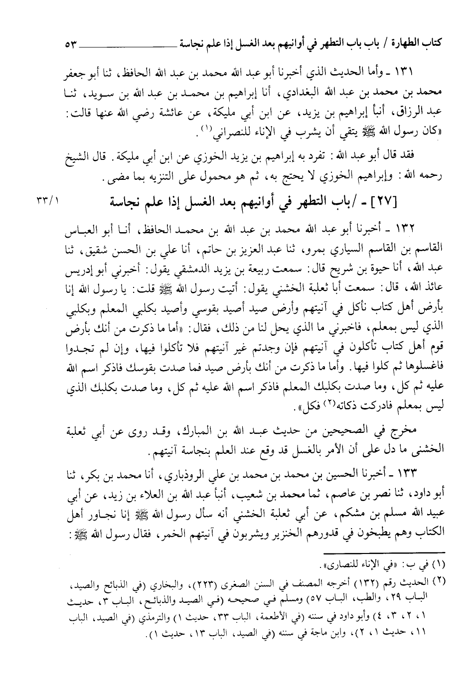 132 - أَخْبَرَنَا أَبُو عَبْدِ اللهِ مُحَمَّدُ بْنُ عَبْدِ اللهِ بْنِ مُحَمَّدٍ الْحَافِظُ، أنا أَبُو الْعَبَّاسِ الْقَاسِمُ بْنُ الْقَاسِمِ السَّيَّارِيُّ بِمَرْوَ، ثنا عَبْدُ الْعَزِيزِ بْنُ حَاتِمٍ، أنا عَلِيُّ بْنُ الْحَسَنِ شَقِيقٌ، ثنا عَبْدُ اللهِ، أنا حَيْوَةُ بْنُ شُرَيْحٍ، قَالَ: سَمِعْتُ رَبِيعَةَ بْنَ يَزِيدَ الدِّمَشْقِيَّ، يَقُولُ: أَخْبَرَنِي أَبُو إِدْرِيسَ عَائِذُ اللهِ، قَالَ: سَمِعْتُ أَبَا ثَعْلَبَةَ الْخُشَنِيَّ، يَقُولُ: أَتَيْتُ رَسُولَ اللهِ صَلَّى اللهُ عَلَيْهِ وَسَلَّمَ، قُلْتُ: يَا رَسُولَ اللهِ، إِنَّا بِأَرْضِ أَهْلِ كِتَابٍ، نَأْكُلُ فِي آنِيَتِهِمْ، وَأَرْضِ صَيْدٍ أَصِيدُ بِقَوْسِي وَأَصِيدُ بِكَلْبِي الْمُعَلَّمِ، وَبِكَلْبِي الَّذِي لَيْسَ بِمُعَلَّمٍ، فَأَخْبِرْنِي: مَا الَّذِي يَحِلُّ لَنَا مِنْ ذَلِكَ؟ فَقَالَ: §" أَمَّا مَا ذَكَرْتَ مِنْ أَنَّكَ بِأَرْضِ قَوْمٍ أَهْلِ كِتَابٍ تَأْكُلُونَ فِي آنِيَتِهِمْ، فَإِنْ وَجَدْتُمْ غَيْرَ آنِيَتِهِمْ فَلَا تَأْكُلُوا فِيهَا، وَإِنْ لَمْ تَجِدُوا فَاغْسِلُوهَا، ثُمَّ كُلُوا فِيهَا، وَأَمَّا مَا ذَكَرْتَ مِنْ أَنَّكَ بِأَرْضِ صَيْدٍ فَمَا صِدْتَ بِقَوْسِكَ فَاذْكُرِ اسْمَ اللهِ عَلَيْهِ ثُمَّ كُلْ، وَمَا صِدْتَ بِكَلْبِكَ الْمُعَلَّمِ، فَاذْكُرِ اسْمَ اللهِ عَلَيْهِ ثُمَّ كُلْ، وَمَا صِدْتَ بِكَلْبِكَ الَّذِي لَيْسَ بِمُعَلَّمٍ فَأَدْرَكْتَ ذَكَاتَهُ فَكُلْ ". مُخَرَّجٌ فِي الصَّحِيحَيْنِ مِنْ حَدِيثِ عَبْدِ اللهِ بْنِ الْمُبَارَكِ، وَقَدْ رُوِيَ عَنْ أَبِي ثَعْلَبَةَ الْخُشَنِيِّ مَا دَلَّ عَلَى أَنَّ الْأَمْرَ بِالْغَسْلِ قَدْ وَقَعَ عِنْدَ الْعِلْمِ بِنَجَاسَةِ آنِيَتِهِمْ
