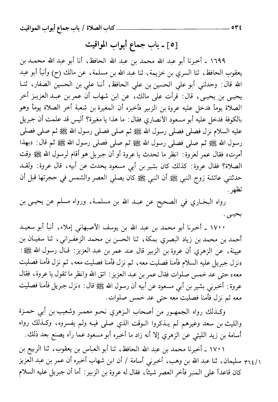 1700 - أَخْبَرَنَا أَبُو مُحَمَّدٍ عَبْدُ اللهِ بْنُ يُوسُفَ الْأَصْبَهَانِيُّ، إِمْلَاءً أنبأ أَبُو سَعِيدٍ أَحْمَدُ بْنُ مُحَمَّدِ بْنِ زِيَادٍ الْبَصْرِيُّ بِمَكَّةَ، ثنا الْحَسَنُ بْنُ مُحَمَّدٍ الزَّعْفَرَانِيُّ ثنا سُفْيَانُ بْنُ عُيَيْنَةَ، عَنِ الزُّهْرِيِّ، أَنَّ عُرْوَةَ بْنَ الزُّبَيْرِ، قَالَ: عِنْدَ عُمَرَ بْنِ عَبْدِ الْعَزِيزِ قَالَ رَسُولُ اللهِ صَلَّى اللهُ عَلَيْهِ وَسَلَّمَ: §" نَزَلَ جِبْرِيلُ عَلَيْهِ السَّلَامُ فَأَمَّنَا فَصَلَّيْتُ مَعَهُ ثُمَّ نَزَلَ فَأَمَّنَا فَصَلَّيْتُ مَعَهُ ثُمَّ نَزَلَ فَأَمَّنَا فَصَلَّيْتُ مَعَهُ حَتَّى عَدَّ خَمْسَ صَلَوَاتٍ " فَقَالَ عُمَرُ بْنُ عَبْدِ الْعَزِيزِ: اتَّقِ اللهَ وَانْظُرْ مَا تَقُولُ يَا عُرْوَةُ فَقَالَ عُرْوَةُ: أَخْبَرَنِي بَشِيرُ بْنُ أَبِي مَسْعُودٍ، عَنْ أَبِيهِ أَنَّ رَسُولَ اللهِ صَلَّى اللهُ عَلَيْهِ وَسَلَّمَ قَالَ: " نَزَلَ جِبْرِيلُ فَأَمَّنَا فَصَلَّيْتُ مَعَهُ ثُمَّ نَزَلَ فَأَمَّنَا فَصَلَّيْتُ مَعَهُ " حَتَّى عَدَّ خَمْسَ صَلَوَاتٍ وَكَذَلِكَ رَوَاهُ الْجُمْهُورَ مِنْ أَصْحَابِ الزُّهْرِيِّ نَحْوَ مَعْمَرٍ وَشُعَيْبُ بْنُ أَبِي حَمْزَةَ وَاللَّيْثُ بْنُ سَعْدٍ وَغَيْرُهُمْ لَمْ يَذْكُرُوا الْوَقْتَ الَّذِي صَلَّى فِيهِ وَلَمْ يُفَسِّرُوهُ وَكَذَلِكَ رَوَاهُ أُسَامَةُ بْنُ زَيْدٍ اللَّيْثِيُّ عَنِ الزُّهْرِيِّ إِلَّا أَنَّهُ زَادَ مَا أَخْبَرَهُ أَبُو مَسْعُودٍ عَمَّا رَآهُ يَصْنَعُ بَعْدَ ذَلِكَ