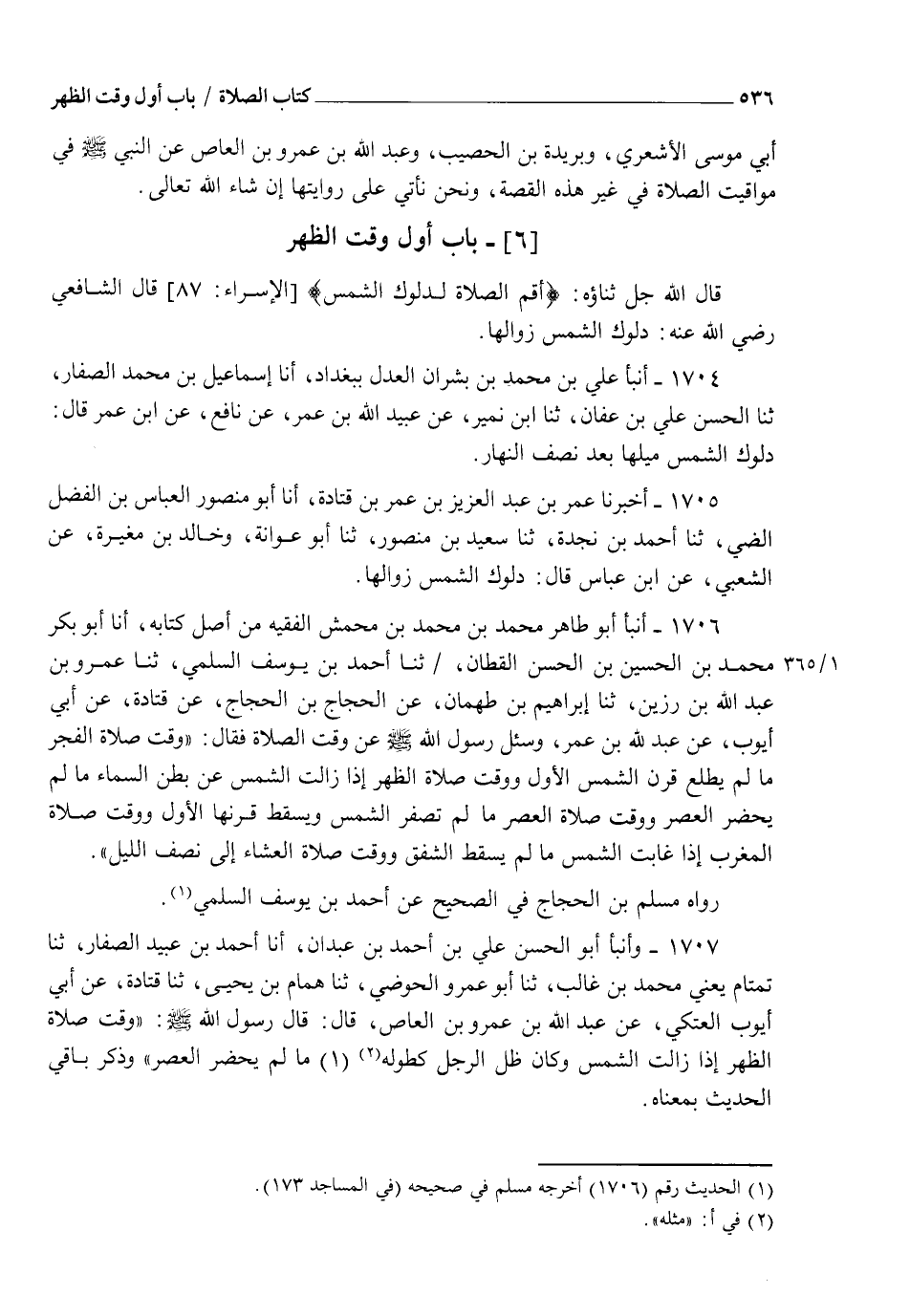 1706 - أنبأ أَبُو طَاهِرٍ مُحَمَّدُ بْنُ مُحَمَّدِ بْنِ مِحْمَشٍ الْفَقِيهُ مِنْ أَصْلِ كِتَابِهِ أنا أَبُو بَكْرٍ مُحَمَّدُ بْنُ الْحُسَيْنِ بْنِ الْحَسَنِ الْقَطَّانُ ثنا أَحْمَدُ بْنُ يُوسُفَ السُّلَمِيُّ ثنا عَمْرُو بْنُ عَبْدِ اللهِ بْنِ رَزِينٍ ثنا إِبْرَاهِيمُ بْنُ طَهْمَانَ، عَنِ الْحَجَّاجِ بْنِ الْحَجَّاجِ عَنْ قَتَادَةَ عَنْ أَبِي أَيُّوبَ عَنْ عَبْدِ اللهِ بْنِ عَمْرٍو، سُئِلَ رَسُولُ اللهِ صَلَّى اللهُ عَلَيْهِ وَسَلَّمَ عَنْ وَقْتِ الصَّلَاةِ فَقَالَ: " §وَقْتُ صَلَاةِ الْفَجْرِ مَا لَمْ يَطْلُعْ قَرْنُ الشَّمْسِ الْأَوَّلُ، وَوَقْتُ صَلَاةِ الظُّهْرِ إِذَا زَالَتِ الشَّمْسُ عَنْ بَطْنِ السَّمَاءِ مَا لَمْ يَحْضُرِ الْعَصْرُ، وَوَقْتُ صَلَاةِ الْعَصْرِ مَا لَمْ تَصْفَرَّ الشَّمْسُ وَيَسْقُطُ قَرْنُهَا الْأَوَّلُ، وَوَقْتُ صَلَاةِ الْمَغْرِبِ إِذَا غَابَتِ الشَّمْسُ مَا لَمْ يَسْقُطِ الشَّفَقُ، وَوَقْتُ صَلَاةِ الْعِشَاءِ إِلَى نِصْفِ اللَّيْلِ " رَوَاهُ مُسْلِمُ بْنُ الْحَجَّاجِ فِي الصَّحِيحِ عَنْ أَحْمَدِ بْنِ يُوسُفَ السُّلَمِيِّ