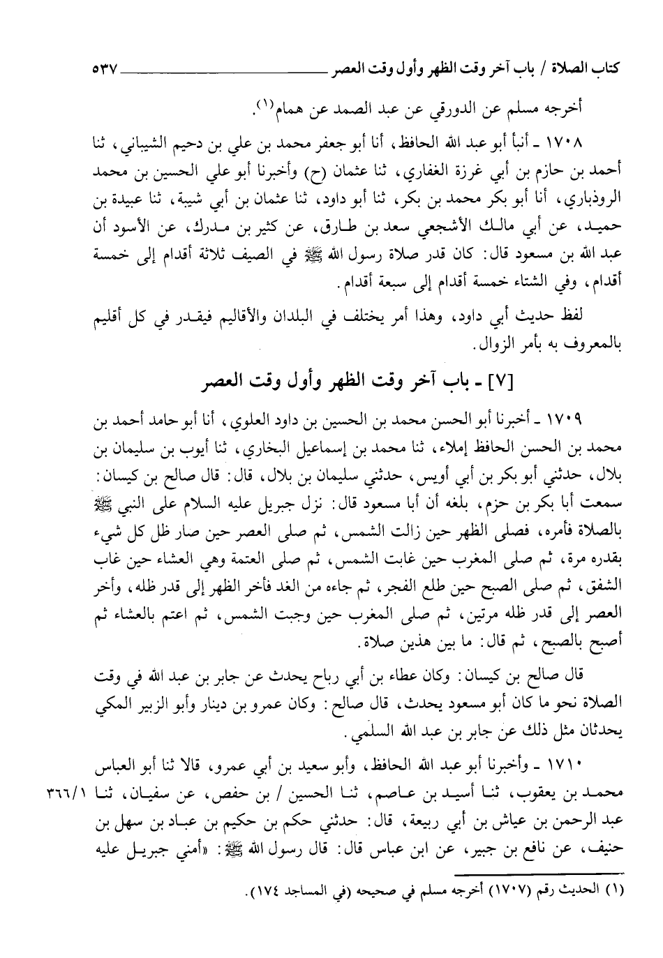 1708 - أنبأ أَبُو عَبْدِ اللهِ الْحَافِظُ، أنا أَبُو جَعْفَرٍ مُحَمَّدُ بْنُ عَلِيِّ بْنِ دُحَيْمٍ الشَّيْبَانِيُّ، ثنا أَحْمَدُ بْنُ حَازِمِ بْنِ أَبِي غَرَزَةَ الْغِفَارِيُّ ثنا عُثْمَانُ، ح. وَأَخْبَرَنَا أَبُو عَلِيٍّ الْحُسَيْنُ بْنُ مُحَمَّدٍ الرُّوذْبَارِيُّ، أنا أَبُو بَكْرٍ مُحَمَّدُ بْنُ بَكْرٍ ثنا أَبُو دَاوُدَ ثنا عُثْمَانُ بْنُ أَبِي شَيْبَةَ ثنا عَبِيدَةُ بْنُ حُمَيْدٍ عَنْ أَبِي مَالِكٍ الْأَشْجَعِيِّ سَعْدِ بْنِ طَارِقٍ عَنْ كَثِيرِ بْنِ مُدْرِكٍ، عَنِ الْأَسْوَدِ، أَنَّ عَبْدَ اللهِ بْنَ مَسْعُودٍ، قَالَ: §كَانَ قَدْرُ صَلَاةِ رَسُولِ اللهِ صَلَّى اللهُ عَلَيْهِ وَسَلَّمَ فِي الصَّيْفِ ثَلَاثَةَ أَقْدَامٍ إِلَى خَمْسَةِ أَقْدَامٍ وَفِي الشِّتَاءِ خَمْسَةَ أَقْدَامٍ إِلَى سَبْعَةِ أَقْدَامٍ " لَفْظُ حَدِيثِ أَبِي دَاوُدَ وَهَذَا أَمْرٌ يَخْتَلِفُ فِي الْبُلْدَانِ وَالْأَقَالِيمِ فَيُقَدَّرُ فِي كُلِّ إِقْلِيمٍ بِالْمَعْرُوفِ بِهِ بِأَمْرِ الزَّوَالِ