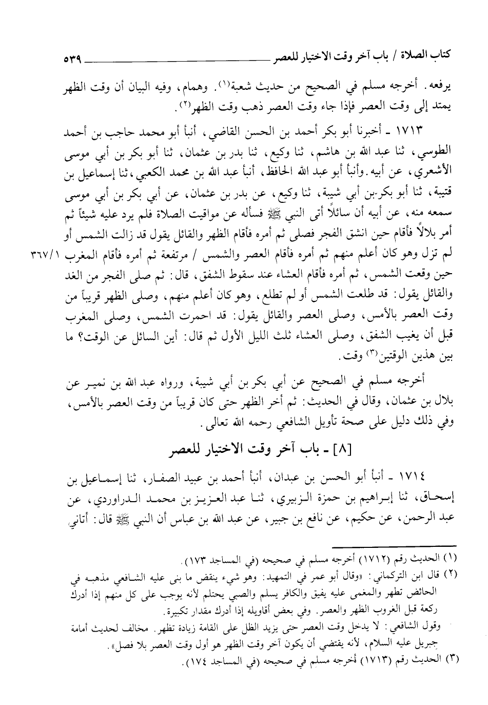 1713 - أَخْبَرَنَا أَبُو بَكْرٍ أَحْمَدُ بْنُ الْحَسَنِ الْقَاضِي أنبأ أَبُو مُحَمَّدٍ حَاجِبُ بْنُ أَحْمَدَ الطُّوسِيُّ، ثنا عَبْدُ اللهِ بْنُ هَاشِمٍ ثنا وَكِيعٌ ثنا بَدْرُ بْنُ عُثْمَانَ ثنا أَبُو بَكْرِ بْنُ أَبِي مُوسَى الْأَشْعَرِيُّ عَنْ أَبِيهِ، وَأنبأ أَبُو عَبْدِ اللهِ الْحَافِظُ، أنبأ عَبْدُ اللهِ بْنُ مُحَمَّدٍ الْكَعْبِيُّ ثنا إِسْمَاعِيلُ بْنُ قُتَيْبَةَ ثنا أَبُو بَكْرِ بْنُ أَبِي شَيْبَةَ ثنا وَكِيعٌ عَنْ بَدْرِ بْنِ عُثْمَانَ عَنْ أَبِي بَكْرِ بْنِ أَبِي مُوسَى، سَمِعَهُ مِنْهُ عَنْ أَبِيهِ، أَنَّ سَائِلًا أَتَى النَّبِيَّ صَلَّى اللهُ عَلَيْهِ وَسَلَّمَ فَسَأَلَهُ عَنْ مَوَاقِيتِ الصَّلَاةِ فَلَمْ يَرُدَّ عَلَيْهِ شَيْئًا ثُمَّ أَمَرَ بِلَالًا فَأَقَامَ حِينَ انْشَقَّ الْفَجْرُ فَصَلَّى، ثُمَّ أَمَرَهُ فَأَقَامَ الظُّهْرَ وَالْقَائِلُ يَقُولُ: قَدْ زَالَتِ الشَّمْسُ أَوْ لَمْ تَزُلْ وَهُوَ كَانَ أَعْلَمَ مِنْهُمْ، ثُمَّ أَمَرَهُ فَأَقَامَ الْعَصْرَ وَالشَّمْسُ مُرْتَفِعَةٌ، ثُمَّ أَمَرَهُ فَأَقَامَ الْمَغْرِبَ حِينَ وَقَعَتِ الشَّمْسُ، ثُمَّ أَمَرَهُ فَأَقَامَ الْعِشَاءَ عِنْدَ سُقُوطِ الشَّفَقِ، قَالَ: ثُمَّ صَلَّى الْفَجْرَ مِنَ الْغَدِ وَالْقَائِلُ يَقُولُ: قَدْ طَلَعَتِ الشَّمْسُ أَوْ لَمْ تَطْلُعْ وَهُوَ كَانَ أَعْلَمَ مِنْهُمْ، وَصَلَّى الظُّهْرَ قَرِيبًا مِنْ وَقْتِ الْعَصْرِ بِالْأَمْسِ، وَصَلَّى الْعَصْرَ وَالْقَائِلُ يَقُولُ، قَدِ احْمَرَّتِ الشَّمْسُ، وَصَلَّى الْمَغْرِبَ قَبْلَ أَنْ يَغِيبَ الشَّفَقُ وَصَلَّى الْعِشَاءَ ثُلُثَ اللَّيْلِ الْأَوَّلَ ثُمَّ قَالَ: " أَيْنَ السَّائِلُ عَنِ الْوَقْتِ؟ §مَا بَيْنَ هَذَيْنِ الْوَقْتَيْنِ وَقْتٌ " أَخْرَجَهُ مُسْلِمٌ فِي الصَّحِيحِ، عَنْ أَبِي بَكْرِ بْنِ أَبِي شَيْبَةَ وَرَوَاهُ عَبْدُ اللهِ بْنُ نُمَيْرٍ، عَنْ بِلَالِ بْنِ عُثْمَانَ وَقَالَ فِي الْحَدِيثِ: ثُمَّ أَخَّرَ الظُّهْرَ حَتَّى كَانَ قَرِيبًا مِنْ وَقْتِ الْعَصْرِ بِالْأَمْسِ وَفِي ذَلِكَ دَلِيلٌ عَلَى صِحَّةِ تَأْوِيلِ الشَّافِعِيِّ رَحِمَهُ اللهُ تَعَالَى