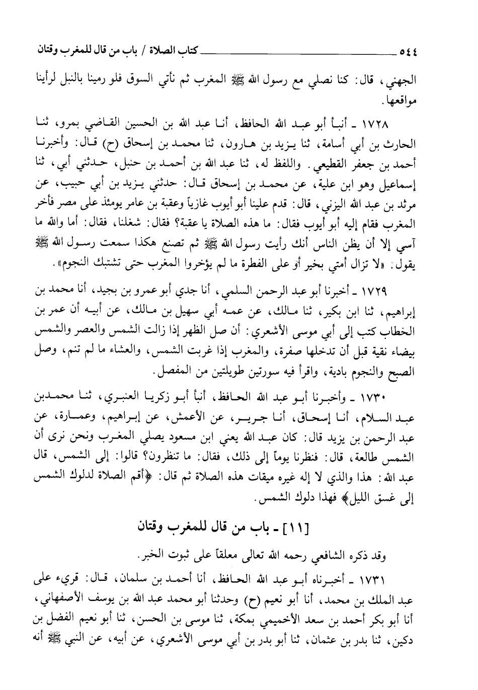 1728 - أنبأ أَبُو عَبْدِ اللهِ الْحَافِظُ، أنا عَبْدُ اللهِ بْنُ الْحُسَيْنِ الْقَاضِي بِمَرْوَ، ثنا الْحَارِثُ بْنُ أَبِي أُسَامَةَ ثنا يَزِيدُ بْنُ هَارُونَ ثنا مُحَمَّدُ بْنُ إِسْحَاقَ، ح. قَالَ: وَأَخْبَرَنَا أَحْمَدُ بْنُ جَعْفَرٍ الْقَطِيعِيُّ وَاللَّفْظُ لَهُ، ثنا عَبْدُ اللهِ بْنُ أَحْمَدَ بْنِ حَنْبَلٍ، حَدَّثَنِي أَبِي ثنا إِسْمَاعِيلُ، وَهُوَ ابْنُ عُلَيَّةَ، عَنْ مُحَمَّدِ بْنِ إِسْحَاقَ، قَالَ: حَدَّثَنِي يَزِيدُ بْنُ أَبِي حَبِيبٍ عَنْ مَرْثَدِ بْنِ عَبْدِ اللهِ الْيَزَنِيُّ، قَالَ: قَدِمَ عَلَيْنَا أَبُو أَيُّوبَ غَازِيًا وَعُقْبَةُ بْنُ عَامِرٍ يَوْمَئِذٍ عَلَى مِصْرَ فَأَخَّرَ الْمَغْرِبَ فَقَامَ إِلَيْهِ أَبُو أَيُّوبَ فَقَالَ: مَا هَذِهِ الصَّلَاةُ يَا عُقْبَةُ؟ فَقَالَ: شُغِلْنَا فَقَالَ: أَمَا وَاللهِ مَا آسَى إِلَّا أَنْ يَظُنَّ النَّاسُ أَنَّكَ رَأَيْتَ رَسُولَ اللهِ صَلَّى اللهُ عَلَيْهِ وَسَلَّمَ ثُمَّ تَصْنَعُ هَكَذَا، سَمِعْتُ رَسُولَ اللهِ صَلَّى اللهُ عَلَيْهِ وَسَلَّمَ يَقُولُ: §" لَا تَزَالُ أُمَّتِي بِخَيْرٍ - أَوْ عَلَى الْفِطْرَةِ - مَا لَمْ يُؤَخِّرُوا الْمَغْرِبَ حَتَّى تَشْتَبِكَ النُّجُومُ "